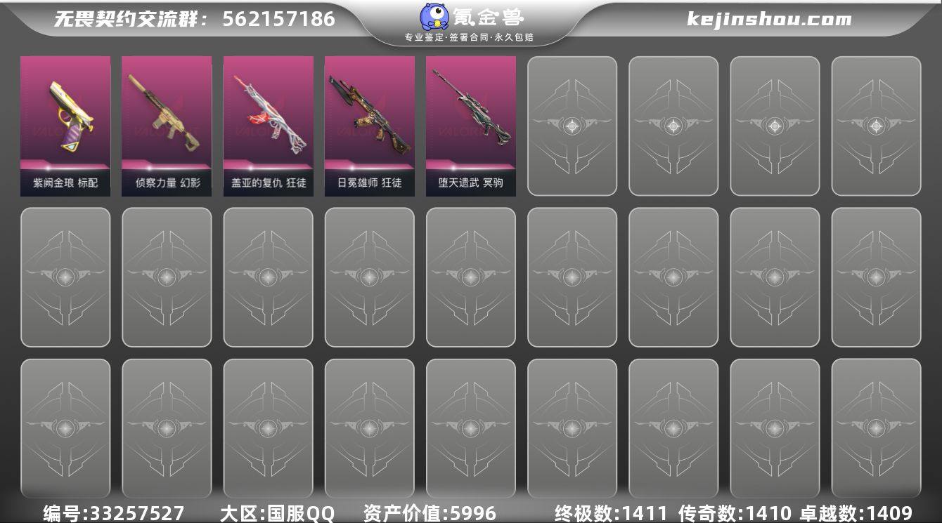 【英雄】:炼狱,暮蝶,壹决,捷风,不死鸟,贤者,猎枭,芮娜 【近战武器】:近战武器-碎心裂刃,近战武器-ORA x 颗秒 军刀 【狂徒】:狂徒-盖亚的复仇,狂徒-日冕雄师 【幻影】:幻影-侦察力量 【冥驹】:冥驹-堕天遗武 【追猎】:追猎-掠影//3.0 【标配】:标配-紫阙金琅 【正义】:正义-游戏结束 【卡面】:Clutch 卡面,无畏契约:尚勃勒 卡面,无畏契约GO!第一卷:芮娜 卡面,无畏契约GO!第一卷:零 卡面,纪念照 P2 卡面,代号红色 卡面,新兵报到 卡面,V契约 卡面,无畏契约 卡面 【喷漆】:小丑猫 喷漆,致命优雅 喷漆,霓光四射 喷漆,买装还是存钱 喷漆,关门放狗 喷漆,酷熊冲浪 喷漆,红鳞 喷漆,无畏契约GO!第一卷:捷风 喷漆,暴走萝莉 喷漆,松叶 喷漆,放下武器 喷漆,胜利属于无畏契约 喷漆,GLHF 喷漆,无畏契约 喷漆 【挂饰】:瞬云履 挂饰,薰衣草之心 挂饰,Z世代特饮 挂饰,天外飞客 挂饰,红鳞松叶 挂饰,《双城之战》魄罗 挂饰,冬日絮语 挂饰,无畏契约 纪念币 挂饰
