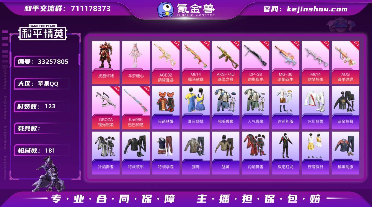 可二次【2粉装10特效枪 可秒换绑不用等】 苹果Q区-47176热力值-123套装-181枪皮 【2粉装】 虎痴许褚 角色-羊梦糖心【10特效枪】 Mk14-福马献瑞(5级) AKS-74U-森灵之息(5级) ACE32-萌骑漫游(2级) 燃烧瓶-薄荷可可(6级) Mk14-甜梦熊击(5级) GROZA-镜光银凌(5级) Kar98K-巳巳如意(5级) DP-28-豹影疾电(5级) AUG-暖羊咩咩(5级) MG-36-沧焰双生(5级)【18热门】 M416-蓝色火焰 长空猛禽 霓虹街区 破蛋小黄鸡 小丑鱼 英勇保护者 极速红龙 白色伏地魔 SS27特训 SS25特训 SCAR-L-玉兔迎春 M762-天降萌叽 M762-彩虹符号 M249-彩虹符号 MG3-幻世战舞者 AKM-星之彼岸 呆萌铁蟹【1飞行器】 炫彩糖果飞行器 营地ID:968327016