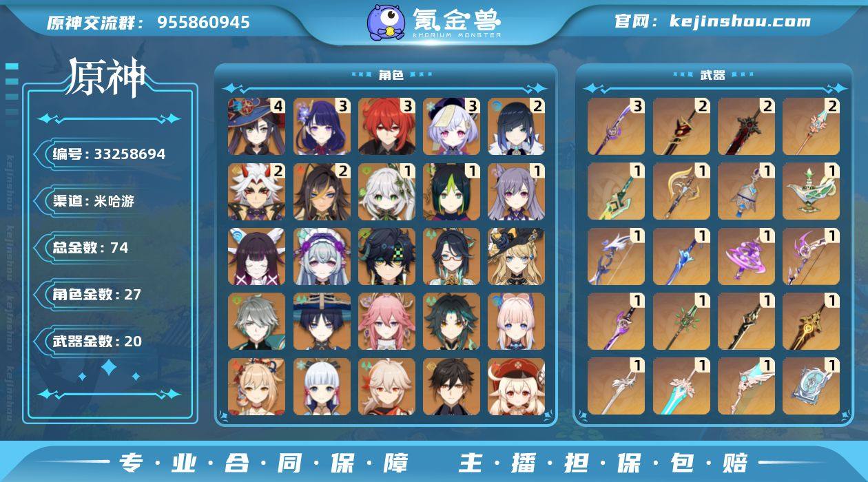 59级/74黄/女主/27个五星角色/20个五星武器 0命闲云,0命娜维娅,2命迪希雅,0命艾尔海森,0命流浪者,1命纳西妲,1命提纳里,2命夜兰,0命八重神子,2命荒泷一斗,3命雷电将军,0命枫原万叶,0命神里绫华,0命钟离,0命魈,0命宵宫,0命温迪,0命可莉,0命珊瑚宫心海,1命刻晴,3命七七,0命琴,4命莫娜,3命迪卢克,0命基尼奇,0命梦见月瑞希,0命哥伦比娅,精1裁断,精1苇海信标,精1图莱杜拉的回忆,精1千夜浮梦,精1若水,精1波乱月白经津,精1神乐之真意,精2赤角石溃杵,精3薙草之稻光,精1飞雷之弦振,精1雾切之回光,精1四风原典,精1和璞鸢,精2天空之脊,精1天空之翼,精1斫峰之刃,精1风鹰剑,精2狼的末路,精1天空之傲,精1山王长牙