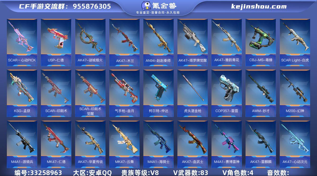 x2411 VIP8级,王心,冰皮王影,王翼,冰皮王势,王尊,王怒,王神,白金王魂,冰皮王隐,王迹,冰皮王啸,火皮王锋,冰皮王击,M4星象,烽火连城M4仲达,AN盖,MK47仁德,AWM妙才,CZS2仲康,KSG孟获,王兽雷,烟雾弹-雷霆王者,王者之势烟雾弹,王者之势闪光弹,王者之影烟雾弹,王者之影闪光弹,王者之竞手雷,王者之翼烟雾弹,王者之翼闪光弹,高爆手雷-雷暴王者,祝融夫人,虹儿,审判者,葵,瞳,关小雨,狙击枪线4最终消灭1消灭音效5;【王者武器】:王者之心,王者之影,王者之翼,王者之势,王者之尊,王者之怒,王者之神,王者之魂,王者之隐,王者之迹,王者之啸,王者之锋,王者之击,王者之兽手雷,王者之竞手雷,高爆手雷-雷暴王者,王者之翼闪光弹,王者之影闪光弹,王者之势闪光弹,王者之兽闪光弹,王者之影烟雾弹,王者之翼烟雾弹,王者之势烟雾弹,烟雾弹-雷霆王者,王者之兽烟雾弹;【三国武器】:M4A1-星象,M4A1-仲达,AN94-盖,MK47-仁德,AWM-妙才,CZS2-仲康,KSG-孟获,USP-仁德,双持沙鹰-元让,左轮-卧龙觉醒,双持GLOCK18-本初,QSZ92-盖,柯尔特-仲达,CZ75-策,气勇胆烈戟,虎头湛金枪,激昂霸王枪,啖睛矢,思召剑,苦肉鞭;【热门武器】:AK...