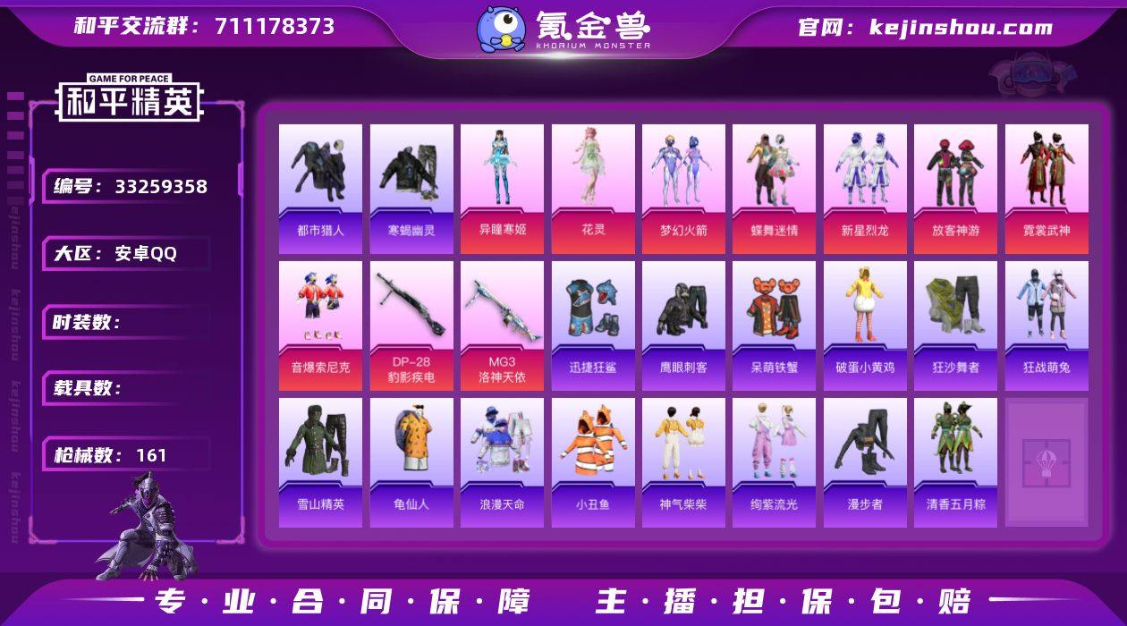 0载具-151套装-161枪皮-安卓手Q/身法地铁哥首选小号+地铁满天赋+苏尔南2钻手枪/都市+神游眼罩+寒蝎+浪漫天命+梦幻火箭/-9王牌印记-8粉装-5特效枪-48961热力值-151套装-161枪皮-4卓越印记-4传奇印记 【8粉装】角色-异瞳寒姬,角色-花灵,套装-梦幻火箭,套装-新星烈龙,套装-音爆索尼克,套装-放客神游,套装-霓裳武神,套装-蝶舞迷情 【5特效枪】MG3-洛神天依/5级,Mk14-福马献瑞/5级,ACE32-萌骑漫游/3级,DP-28-豹影疾电/4级,AKS-74U-森灵之息/5级 【7稀有紫装】都市猎人,寒蝎幽灵,浪漫天命,雪山精英,迅捷狂鲨,小丑鱼,龟仙人 【147稀有时装】梦幻火箭,放客神游,新星烈龙,蝶舞迷情,霓裳武神,花灵,异瞳寒姬,音爆索尼克,迅捷龙虾,SS38特训,都市猎人,浪漫天命,寒蝎幽灵,龟仙人,雪山精英,小丑鱼,迅捷狂鲨,狂战萌兔,狂沙舞者,萌趣咩咩,霜刃之御,白糯汤圆,街头风暴,TT战队服,杯旋调茶师,战术大师,马上有钱,元素星魂,午间小调,朱霞炽焰,狂鲨锋刃,阳光菠萝,喜羊羊,凌霄紫焰,粉黛兰香,云魄琉璃,擎苍青焰,炫彩糖果,萌鸡速递,风迹短诗,超能元气,秘语星愿,雪国风尚,青翼流星,SS35特训,SS31特训,华灯初上,SS36特训,英勇保护者,军械专家,龙的传人,清香五月粽,潮流炫酷,萌黄之夏,SS37特训,特训学院,猎...