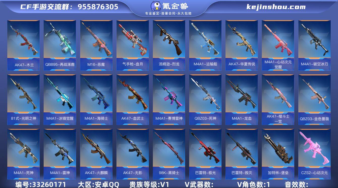 S008 81式-光明之神,M4A1-冰锋觉醒,M4A1-海骑士,AK47-血武士,M4A1-赛博雷神,M4A1-龙血,M4A1-死神,AK47-无影,M4A1-雷神,AK47-火麒麟,98K-黑骑士,巴雷特-极光,巴雷特-毁灭,5-极光,双持斯泰尔-天使,汤姆逊-烈龙,地狱火,USP-神罚,沙鹰-修罗,神罚战斧,马来剑-毁灭,屠龙,M4A1-运输船,AK47-华夏传说,M4A1-心动次元觉醒,M4A1-破空冰刃,QBZ03-死神,AK47-樱斗士-一觉,QBZ03-金色蔷薇,加特林-堡垒,CZS2-心动次元,USP-机械迷城,唐刀-大唐荣耀,手斧-机械迷城,改装GLOCK-木兰,98K-星神,气手枪-血月,M16-恶魔,QBB95-再战涿鹿,蝴蝶刀-天神,AK47-木兰