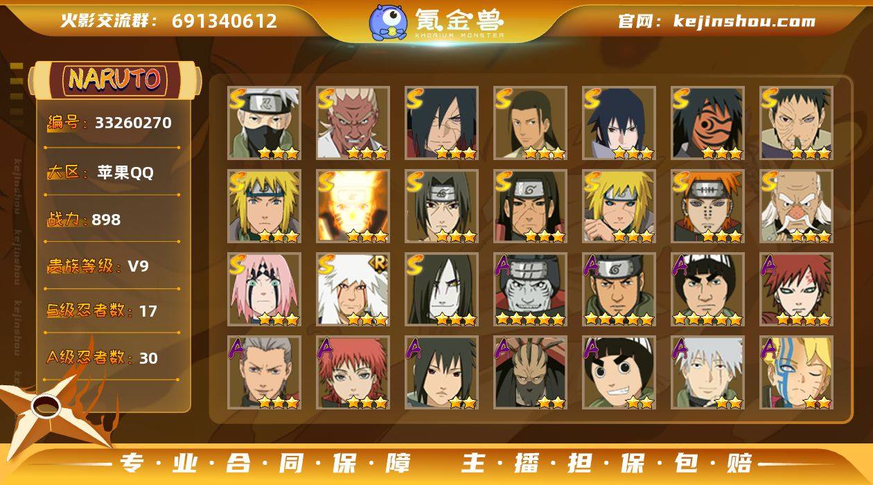17S级忍者数-30A级忍者数 【S级忍者】:波风水门「秽土转生」(3星),千手柱间「秽土转生」(3星),宇智波斑「秽土转生·解」(3星),大野木「忍界大战」(3星),春野樱「忍界大战」(3星),宇智波带土「忍界大战」(3星),艾「忍界大战」(3星),宇智波鼬「须佐能乎」(3星),旗木卡卡西「须佐能乎」(3星),千手柱间「木叶创立」(3星),自来也「舞之豪杰」(3星),大蛇丸(3星),波风水门(3星),神秘面具男「红夜之刃」(3星),漩涡鸣人「九喇嘛连结」(3星),佩恩「天道」(3星),宇智波佐助「永恒万花筒」(3星) 【A级忍者】:艾「青年」(2星),长门「青年」(2星),波风水门「青年」(2星),达鲁伊「博人传」(2星),大蛇丸「晓」(2星),奇拉比(2星),飞段(3星),飞段「死司凭血」(2星),干柿鬼鲛(5星),漩涡博人「桃式显现」(2星),漩涡鸣人「仙人模式」(2星),漩涡鸣人「九尾查克拉」(2星),迈特凯(5星),旗木卡卡西「幻之真容」(2星),我爱罗「疾风传」(4星),蝎(3星),蝎「绯流琥」(2星),猿飞阿斯玛(5星),宇智波止水「新春限定」(2星),宇智波鼬(2星),宇智波佐助「须佐能乎」(2星),宇智波佐助「万花筒写轮眼」(2星),日向宁次「忍界大战」(2星),长十郎「六代目水影」(2星),李洛克...