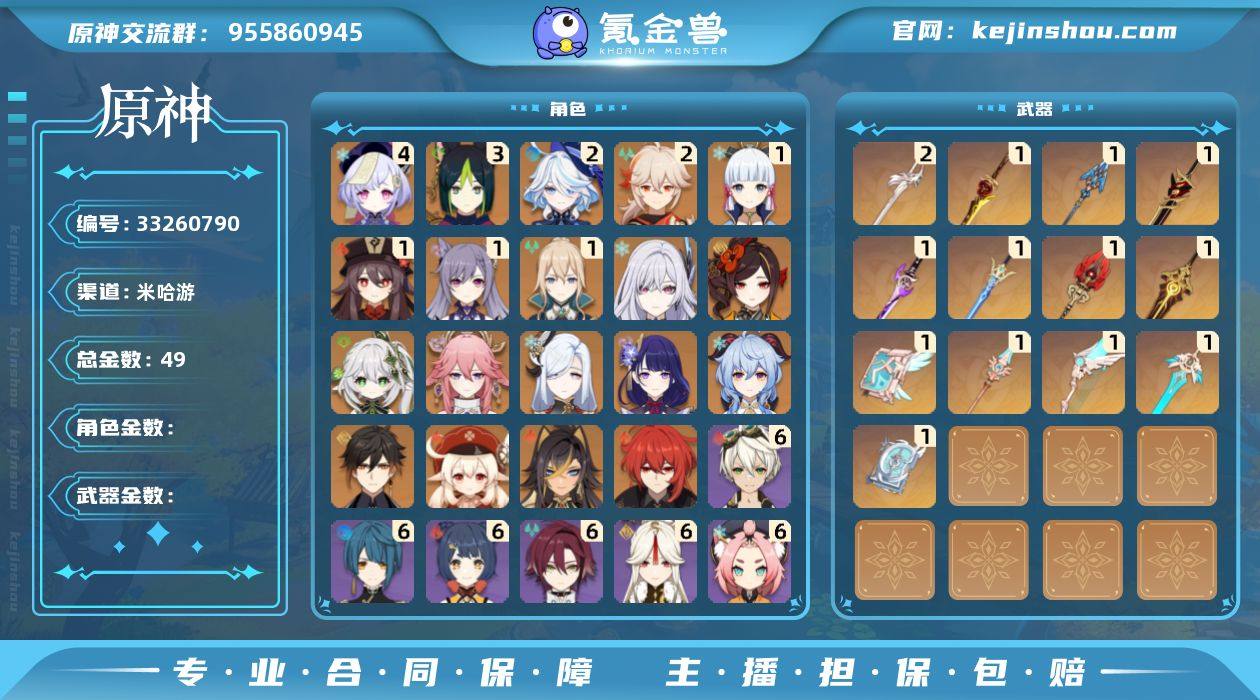 【原神】冒险等级:60,五星数量:33,五星角色:七七 * 4命,提纳里 * 3命,芙宁娜 * 2命,枫原万叶 * 2命,胡桃 * 1命,刻晴 * 1命,琴 * 1命,神里绫华 * 1命,迪希雅,钟离,申鹤,八重神子,千织,丝柯克,纳西妲,迪卢克,甘雨,可莉,雷电将军__五星武器:风鹰剑 * 2精,苇海信标,有乐御簾切,苍古自由之誓,护摩之杖,四风原典,天空之脊,天空之卷,天空之刃,天空之翼,雾切之回光,赤角石溃杵,息灾__四星角色:班尼特 * 6命,行秋 * 6命,香菱 * 6命,鹿野院平藏 * 6命,凝光 * 6命,迪奥娜 * 6命,砂糖 * 6命,莱依拉 * 6命,芭芭拉 * 6命,云堇 * 6命,托马 * 6命,五郎 * 6命,烟绯 * 6命,重云 * 6命,诺艾尔 * 6命,罗莎莉亚 * 6命,雷泽 * 6命,菲谢尔 * 6命,北斗 * 6命,早柚 * 5命,米卡 * 4命,琳妮特 * 4命,嘉明 * 4命,九条裟罗 * 3命,瑶瑶 * 3命,多莉 * 3命,柯莱 * 3命,赛索斯 * 3命,坎蒂丝 * 2命,珐露珊 * 1命,辛焱 * 1命,菲米尼 * 1命,奇偶·女性,卡齐娜,久岐忍,绮良良,卡维,夏洛蒂,夏沃蕾,塔利雅