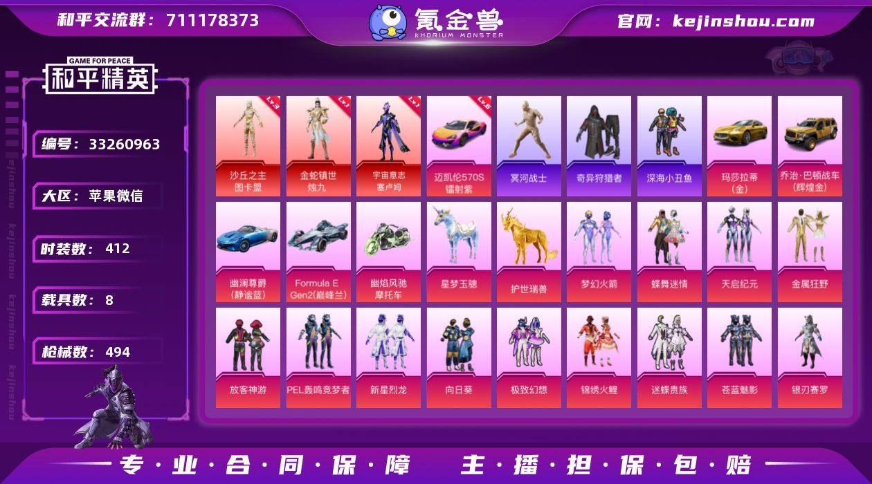 苹果 微信-3神装-41粉装-15特效枪-8载具-16粉色飞行器-201433热力值-23王牌印记-412套装-494枪皮 【红色载具】:迈凯伦570S(镭射紫)(六级) 【红色神装等级】:金蛇镇世-烛九(一级),宇宙意志-塞卢姆(一级),沙丘之主-图卡盟(三级) 【红色角色神装】:金蛇镇世-烛九,宇宙意志-塞卢姆,沙丘之主-图卡盟 【热门品类】:粉装-梦幻火箭,套装-冥河战士,套装-深海小丑鱼,套装-小丑鱼,套装-奇异狩猎者,套装-金羽特工,套装-忍者信条,套装-SS1特训,套装-六号树人,套装-龟仙人,套装-浪漫波比,套装-粉红小猪,角色-8号机,熔岩游骑兵连帽夹克 【粉色套装】:粉装-蝶舞迷情,粉装-梦幻火箭,粉装-天启纪元,粉装-金属狂野,粉装-放客神游,粉装-PEL轰鸣竞梦者,粉装-新星烈龙,粉装-向日葵,粉装-极致幻想,粉装-锦绣火鲤,粉装-迷蝶贵族,粉装-苍蓝魅影,粉装-银刃赛罗,粉装-炙焰红王,粉装-甜梦冰蝶,粉装-馨动时刻,粉装-炙焰赤龙,粉装-蜜桃特工,粉装-葫芦兄弟,粉装-铁血龙王,粉装-彩虹鹿灵,粉装-沙场疾风,粉装-吟月归客,粉装-筑梦精灵,粉装-星夜魔法师,粉装-妙趣可丽,粉装-傲雪凌霜,粉装-霁雪冰心,粉装-冰川红玫,粉装-仲夏莫吉托,粉装-黄族统领,角色-呆...