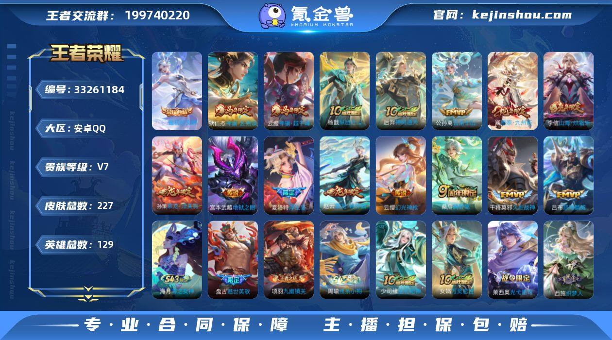 无二次-安卓Q-V7-永恒钻石I段位-129英雄-227皮肤-1典藏皮肤-15传说-63史诗HZ263601 【英雄全皮】:孙权全皮,敖隐全皮 【荣耀典藏】:伽罗最初的交响 【传说皮肤】:云缨神骥越千峰,狄仁杰神骥赴朔漠,杨戬纵目迁山,后羿神树通天,公孙离云诺千山,澜愿照九州拓,云缨幻光神枪,桑启鸣野蒿,孙策乘龙淬吴钩,赵云乘龙铭钟鼎,夏洛特浮生妄,李信山海炽霜斩,吕布怒海麟威,干将莫邪久胜战神,宫本武藏地狱之眼 【限定皮肤】:蒙犽顽岩魄,姜子牙天穹之誓,杨戬破阵退雄兵,李白谪仙醉月,狄仁杰阴阳师,赵云皇家上将,嬴政优雅恋人,庄周高山流水,元歌无心,马可波罗山海玄木吟,狄仁杰魔术师,狄仁杰万华元夜,达摩星际陆战队,达摩沙漠行僧,项羽海滩派对,老夫子醍醐杖,程咬金演武夺筹,兰陵王金庭之子,刘备百相守梦,李元芳云中旅人,钟馗驱傩正仪,鬼谷子原初探秘者,铠青龙志,苏烈千军破阵,百里玄策原初追逐者,沈梦溪大漠名商,明世隐疑决卦,裴擒虎李小龙,裴擒虎擒涛扼浪,米莱狄胡桃异想国,云中君纤云弄巧,李信山海炽霜斩,鲁班大师探海日志,桑启海盐诗旅,夏洛特浮生妄,张良古海寻踪,蒙犽百解令,鬼谷子天穹祈灯,姬小满妄想食味,孙策乘龙淬吴钩,赵...