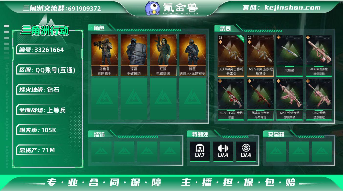 【955365】{特价出售}等级: 60 总资产:71.8M 流动资产: 54.1 M 纯币:105665 隐藏挂饰:毁灭之源,余烬之影*3 肘击王 红皮: 战令皮肤:乌鲁鲁-荒原猎手/红狼-电锯惊魂/深蓝-不破誓约/蜂医-送葬人无题密令 刀皮:北极星 砖皮:AS Val突击步枪-悬赏令(优品C) 特勤处:仓库7,训练4,靶场4