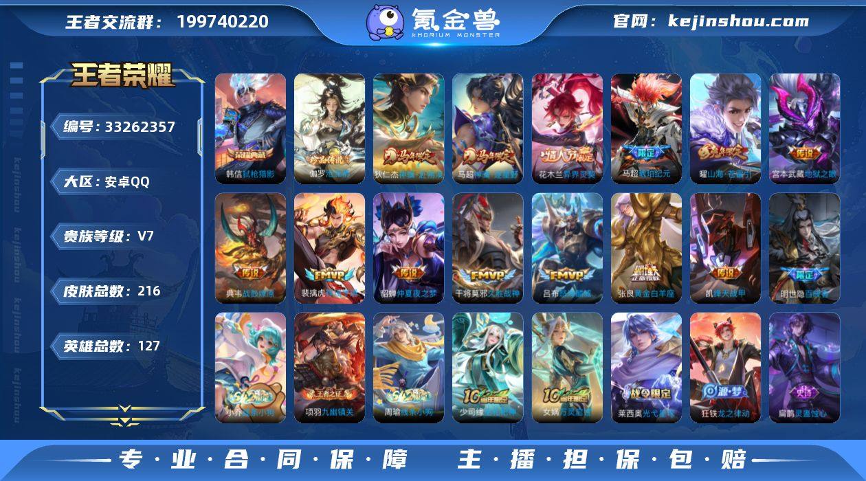 实名: 可修改 性别: 男号 贵族等级: V7 英雄数: 127 皮肤数: 216 荣耀水晶: 弑枪猎影 珍品传说: 沧流箭 传说皮: 绛天战甲,黄金白羊座,久胜战神,仲夏夜之梦,地狱之眼,山海·苍雷引,琥珀纪元马超,典韦战鼓燎原,祥瑞亨通,神骥·赴朔漠,神骥·逐星野,异界灵契-花木兰 限定皮: 李小龙,朱雀志,高山流水,孙行者,猪悟能,傲雪梅枪,五谷丰年,怒海麟威 亮点: 【优质装备】:弑枪猎影(韩信典藏),绛天战甲(鸡嘴战神),黄金白羊座,久胜战神,仲夏夜之梦(大飞蛾),地狱之眼,山海·苍雷引(电光曜子),琥珀纪元马超,沧流箭