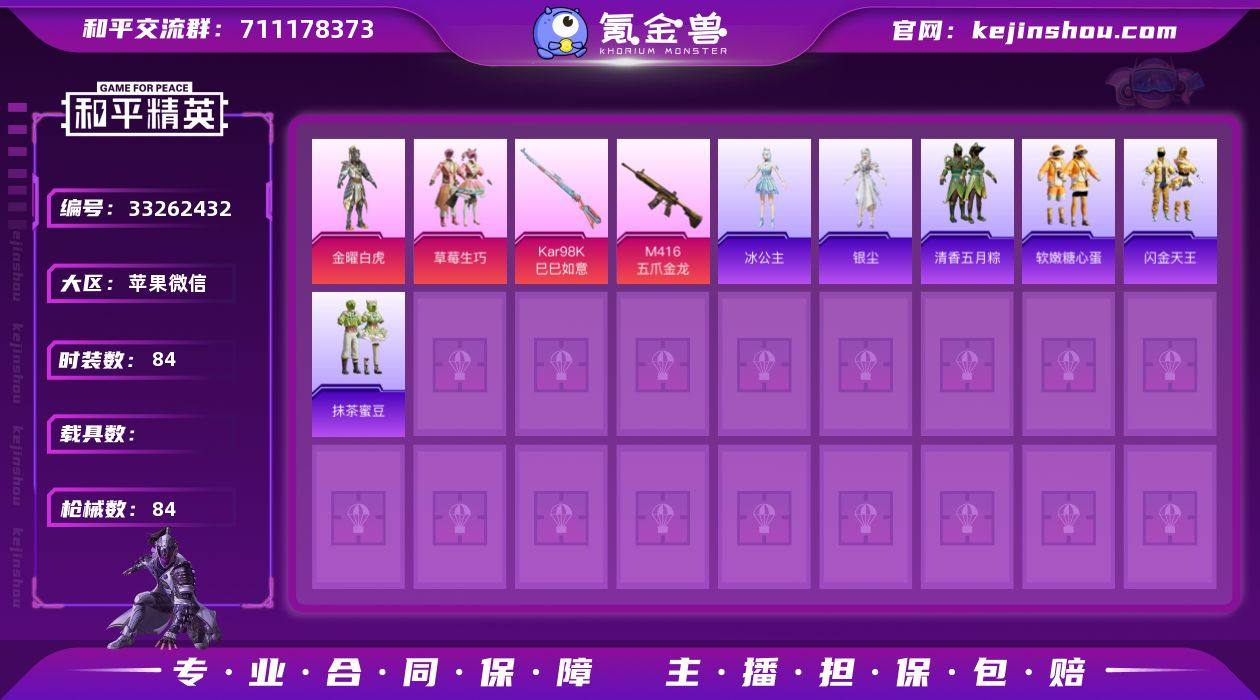 HJ6004 可二 57级 2粉装2特效枪83套装84枪皮 1印记 【2粉装】 金曜白虎 草莓生巧 【2特效枪】 M416-五爪金龙 (7级) Kar98K-巳巳如意 (1级) 【5热门】 雪山精英 薄荷蓝莓 抹茶蜜豆 软嫩糖心蛋 AKM-奇异狩猎者 【1飞行器】 萌物绒绒飞行器 【2头盔】 雪国精灵头盔 夏日绵绵冰头盔 【3背包】 火曜朱雀背包 古堡领主背包 夏日绵绵冰背包