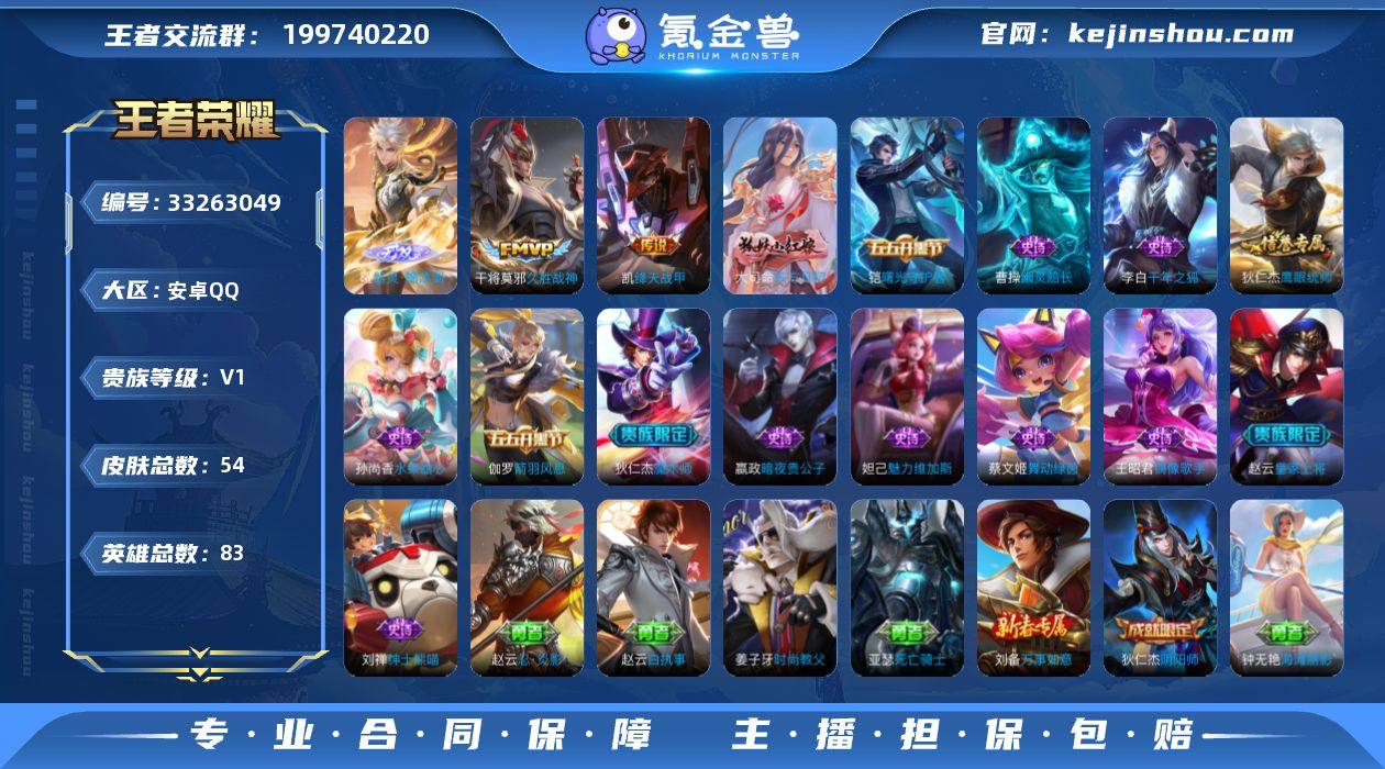 V1 1无双 2传说 54皮肤 83英雄 【1无双】曜-器灵·螭龙剑【2传说】干将莫邪-久胜战神,铠-绛天战甲【14史诗】蔡文姬-舞动绿茵,曹操-幽灵船长,妲己-魅力维加斯,狄仁杰-魔术师,狄仁杰-鹰眼统帅,伽罗-箭羽风息,铠-曙光守护者,李白-千年之狐,刘禅-绅士熊喵,孙尚香-水果甜心,王昭君-偶像歌手,嬴政-暗夜贵公子,赵云-皇家上将,大司命-东方月初