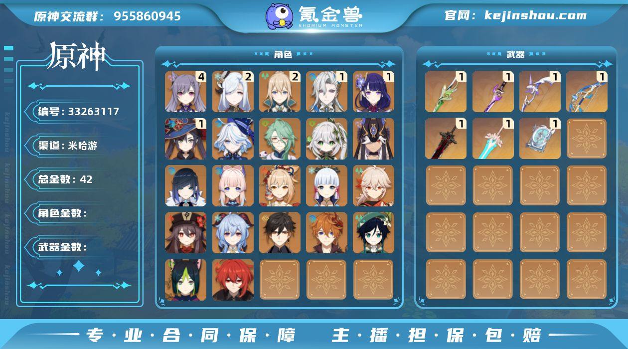 邮箱: 未绑定 总黄数: 42 冒险等级: 57 4命金色角色: 四命刻晴 2命金色角色: 二命琴,二命申鹤 1命金色角色: 一命莫娜,一命雷电将军,一命那维莱特 0命金色角色: 迪卢克,温迪,枫原万叶,神里绫华,宵宫,达达利亚,钟离,甘雨,胡桃,珊瑚宫心海,夜兰,提纳里,赛诺,纳西妲,白术,芙宁娜 1精武器: 狼的末路,雾切之回光,四风原典,阿莫斯之弓,天空之傲,终末嗟叹之诗,裁叶萃光