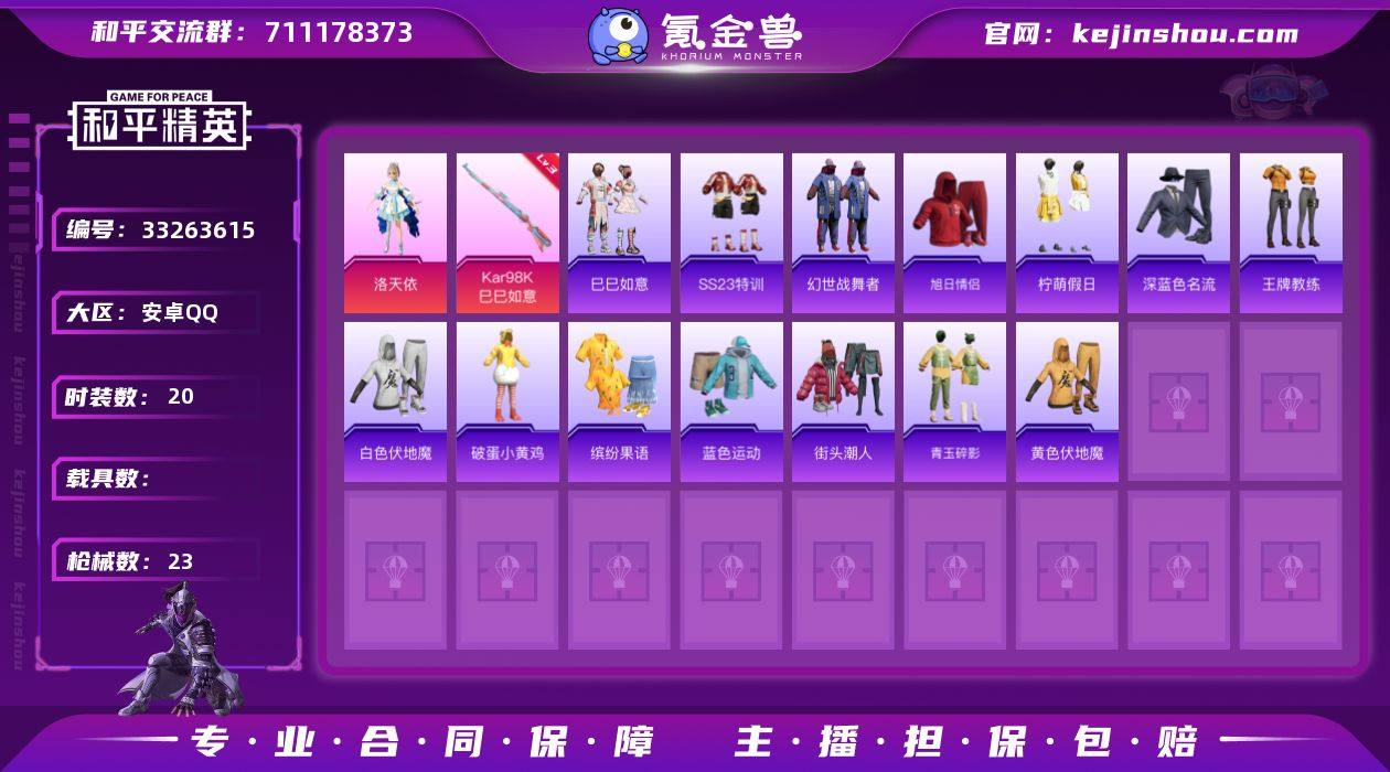 TD2602096 洛天依 无二次 安卓 手Q-1粉装-1特效枪-0载具-0粉色飞行器-6294热力值-1王牌印记-20套装-23枪皮 【粉色套装】:角色-洛天依 【粉色枪皮等级】:Kar98K-巳巳如意(三级) 【粉色枪皮】:Kar98K-巳巳如意 【稀有套装】:套装-巳巳如意,角色-霜刃之御 【稀有枪皮】:M416-糯团青竹,M416-红色方程式,M762-天降萌叽,AC-VAL-天降萌叽,UZI-炫彩节奏,UMP45-涂山之恋,DBS-第五大道,DP-28-彩虹符号,MG3-幻世战舞者 【其他套装】:套装-SS23特训,套装-幻世战舞者,套装-旭日情侣,套装-柠萌假日,套装-深蓝色名流,套装-王牌教练,套装-白色伏地魔,套装-破蛋小黄鸡,套装-缤纷果语,套装-蓝色运动,套装-街头潮人,套装-青玉碎影,套装-黄色伏地魔 【营地ID】:933643026
