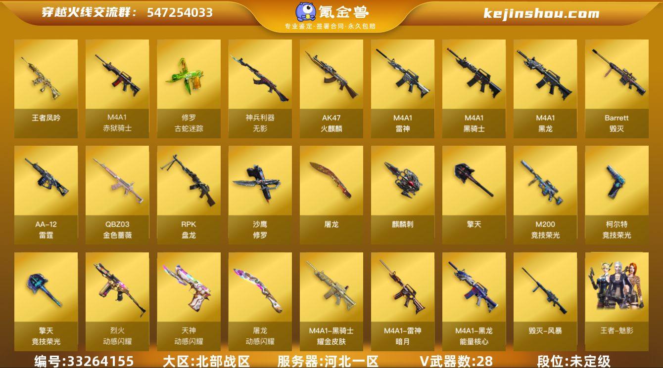 河北一区-28V-10王者-0炫金 【热门武器】:QBZ03-金色蔷薇,修罗-古蛇迷踪,M200-竞技荣光,死亡之眼*2,金色小号,M4A1-黑骑士,RPK-盘龙,加特林-炼狱,裁决-雪莉杨,沙鹰-修罗 【王者炫金武器】:王者凤吟*2 【音效卡】:天神-动感闪耀 音效卡,修罗-云海游龙音效卡,M4A1-黑骑士音效卡 【皮肤】:雷神-暗月,雷神-源计划2.0专属 皮肤,毁灭-风暴,毁灭-英雄计划 皮肤,黑龙-能量核心,黑骑士耀金皮肤,修罗-能量核心 【角色】:王者-魅影,蛇隐宗,乔伊教练,修道士,暗夜-X,北极狐-X,初恋灵狐,芳心审判者,风暴女,虎妞,嘉年华灵狐,零-热舞青春,灵狐-花神,灵狐者-X,灵狐者-黄金海岸,龙儿,麻雀,潘多拉-X,蛇姬,斯沃特-X,兔囡囡,雪莉杨-摸金校尉,樱-战斗天使 【人偶武器】:裁决-雪莉杨,天龙-乔伊教练,Scar Light-马枪,AWM-灵狐-15周年嘉年华,迷你深渊冰龙,迷你裂空之翼*3,迷你牛牛*3,迷你火种,生化手雷-机甲核心,COP-青花瓷-斯沃特精英,M4A1-斯沃特,迷你超能女侍,灵狐娃娃手雷 【暴走生化】:死亡之眼*2 【挑战大师】:神圣爆裂者III,激光毁灭者III-白马银枪*2,VEPR-12-金魔*2,激光毁灭者III,机甲撕裂者III,神圣爆裂者-末日III,阐释者II...
