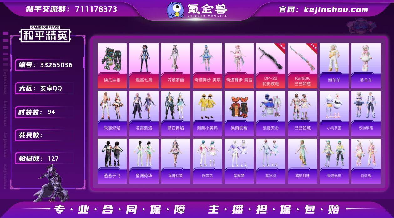 安卓 手Q-7粉装-5特效枪-0载具-1粉色飞行器-34975热力值-6王牌印记-94套装-127枪皮 【热门品类】:套装-浪漫天命,套装-潮萌小黄鸭 【粉色套装】:粉装-快乐主宰,角色-脆鲨七海,角色-冷漠罗丽,角色-奇迹舞步 美琪,角色-奇迹舞步 美雪,角色-月中灵,人物-小舞·雪昙 【粉色枪皮等级】:UMP45-萌骑冒险(四级),AKS-74U-森灵之息(五级),Kar98K-巳巳如意(五级),Mk14-福马献瑞(五级),DP-28-豹影疾电(五级) 【粉色枪皮】:UMP45-萌骑冒险,AKS-74U-森灵之息,Kar98K-巳巳如意,Mk14-福马献瑞,DP-28-豹影疾电 【粉色飞行器】:齐天大圣飞行器 【粉色降落伞】:蜜语绒猫降落伞,樱桃泡泡降落伞,智耀战神降落伞,星穹咏叹调降落伞,御兔特攻降落伞,时光之誓降落伞,奇迹舞步降落伞,鸢尾珑雾降落伞 【稀有套装】:套装-巳巳如意,套装-小鸟芋圆,套装-乐游熊熊,套装-小财神当家,角色-奈斯,套装-马上来财,套装-燕燕于飞,套装-鱼渊荷华,套装-风舞幻音,套装-粉恋花,套装-紫幽梦,套装-蓝冰羽,角色-猎影月神,套装-极速光影,套装-彩虹兔,套装-云朵鹅,套装-雪绒豹,套装-蓝海鲸歌,套装-朱霞炽焰,套装-凌霄紫焰,套装-擎苍青焰,玩偶服-懒羊羊,玩偶服-美羊羊,套装-...