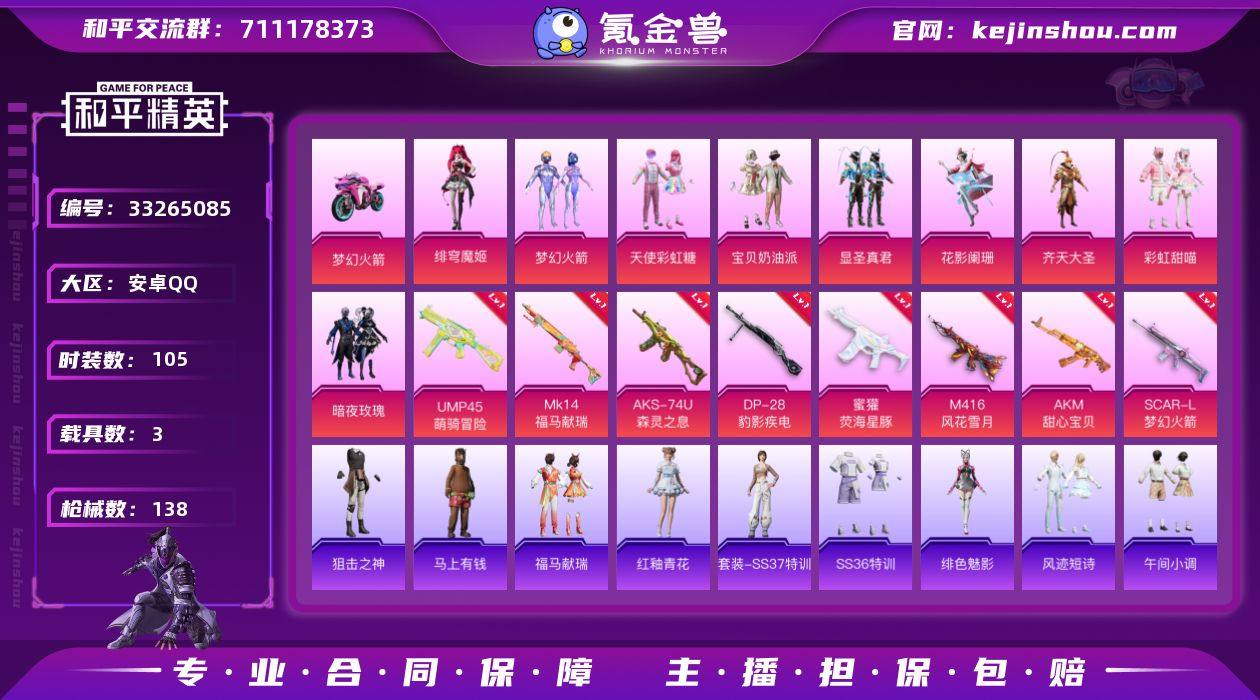 【女号梦幻火箭满级M4风花雪月 AKM甜心宝贝9粉装8特效枪3载具 秒换绑不用等】 安卓Q区-56505热力值-105套装-138枪皮 【3载具】 玛莎拉蒂粉色 兰博SVJ绿色 双人摩托梦幻火箭【9粉装】 梦幻火箭 宝贝奶油派 天使彩虹糖 彩虹甜喵 暗夜玫瑰 齐天大圣 显圣真君 花影阑珊 角色-绯穹魔姬【8特效枪】 AKM-甜心宝贝(6级) M416-风花雪月(7级) AKS-74U-森灵之息(5级) Mk14-福马献瑞(5级) UMP45-萌骑冒险(3级) SCAR-L-梦幻火箭(5级) 蜜獾-荧海星豚(5级) DP-28-豹影疾电(5级)【106热门】 鹰眼刺客 英勇保护者 极速红龙 赛罗奥特曼 团圆交子 瑞龙福将 豚鼠丹丹 GROZA-林间仙鹿 SS3特训 SS2特训 SS25特训 SS24特训 SS23特训 SS22特训 Mini14-梦幻火箭 M762-乌木金纹 Kar98K-电玩视界 SCAR-L-玉兔迎春 Mk47-乌木金纹 UZI-娇憨猪猪 MG3-幻世战舞者 AKM-虎虎生威 M416-葫芦兄弟 M416-蓝色火焰 众神之王 长空猛禽 虚音幻奏 甜心亚梦 甜蜜熊情侣 青涩时光 骑行爱好者 平底锅-甜心宝贝 暖心熊熊 牛气冲天 梦幻奶油 黎明保卫者 坚韧舞者 漫步者 黑色伏地魔 M762-瑞龙福将 AKM-奇异狩猎者 AA12-G-雨过天青 沙漠之鹰-雨过天青 M16A4-雨过天青 AC-VAL-荒原烈焰 雨过天青 GROZA-福马献瑞 SS34特训 S1897-...