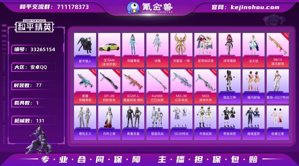 【都市男神7特效枪6粉装1载具 秒换绑不用等】 安卓Q区-41275热力值-77套装-131枪皮 【1载具】 宝马M4(圣保罗黄)【1稀有】 都市猎人【6粉装】 洛天依 角色-异瞳寒姬 角色-凤凰座 一辉 角色-绯穹魔姬 星穹咏叹调 角色-冰魄【7特效枪】 Mk14-福马献瑞(5级) MG3-洛神天依(5级) 蜜獾-异瞳寒姬(5级) Kar98K-巳巳如意(5级) DP-28-豹影疾电(5级) MG-36-幻彩电音(6级) SCAR-L-魔童闹海 哪吒(3级)【153热门】 Mk47-洛神天依 SCAR-L-玉兔迎春 M762-天降萌叽 M762-彩虹符号 M249-彩虹符号 MG3-幻世战舞者 呆萌铁蟹 鹰眼刺客 破蛋小黄鸡 特训学院 魅力单车 漫步者 黑色伏地魔 海岛探路者 平底锅-画境星梦 P90-紫矿核心 GROZA-紫矿核心 顶瓜瓜 M249-无面战甲 M416-魔童闹海 敖闰 F57-魔童闹海 冰河战士 燃点复合弓-火尖莲影 破片手榴弹-火尖莲影 MG-36-薄荷星砂 GROZA-福马献瑞 撬棍-火尖枪 SS34特训 达芬奇 朱霞炽焰 星影赞美诗 撬棍-冰晶雪宝 AWM-天降萌叽 福马献瑞 大橘大利 彩虹兔 凌霄紫焰 月烬之祷 蓝冰羽 龙魂突击队 破片手榴弹-爆破雪人 ACE32-冰晶雪宝 擎苍青焰 青翼流星 理性主义 海盐绵绵冰 M16A4-冰河战士 SS33特训 SS32特训 紫幽梦 绯色魅影 雪绒豹 游乐 粉黛兰香 狂鲨锋刃 SS3...