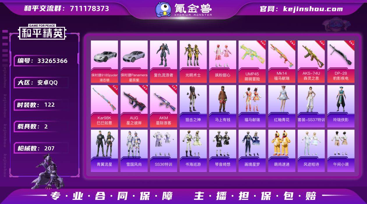 可二次实名【满级AKM星际浪客猫包7特效枪3粉装2载具 秒换绑不用等】 安卓Q区-56403热力值-122套装-207枪皮 【2载具】 保时捷918 Spyder(液态银) 保时捷Panamera(星辰紫)【2稀有】 百万伏待背包(猫包) AKM-百万伏特【3粉装】 复仇流浪者 光明术士 飒粉甜心【7特效枪】 AKS-74U-森灵之息(4级) Mk14-福马献瑞(5级) UMP45-萌骑冒险(4级) AKM-星际浪客(7级) AUG-星之彼岸(5级) Kar98K-巳巳如意(5级) DP-28-豹影疾电(5级)【180热门】 小丑鱼 迅捷狂鲨 军刀雅典娜 白色伏地魔 SS27特训 SS26特训 SS25特训 SS24特训 SS23特训 SS22特训 AWM-不夜海上花 AKM-缤纷海域 SCAR-L-玉兔迎春 GROZA-田园牧歌 M762-天降萌叽 M762-彩虹符号 Mk47-乌木金纹 Mini14-旋转彩虹 UZI-娇憨猪猪 UMP45-蓝色火焰 DBS-彩虹符号 MG3-幻世战舞者 呆萌铁蟹 M416-暗夜行者 鹰眼刺客 M416-蓝色火焰 GROZA-彩虹符号 破蛋小黄鸡 长空猛禽 弄潮海豚 甜蜜熊情侣 特训学院 霓虹街区 妙红点点 梦幻奶油 懵萌河马 蓝色运动 漫步者 和煦暖阳 海岛探路者 M24-奇异狩猎者 M762-奇异狩猎者 S1897-糯团青竹 AA12-G-雨过天青 沙漠之鹰-雨过天青 Mini14-绯穹魔姬 平底锅-星际浪客 平底锅-画境星梦 P90-紫矿核心 玲珑侠影 M16A...