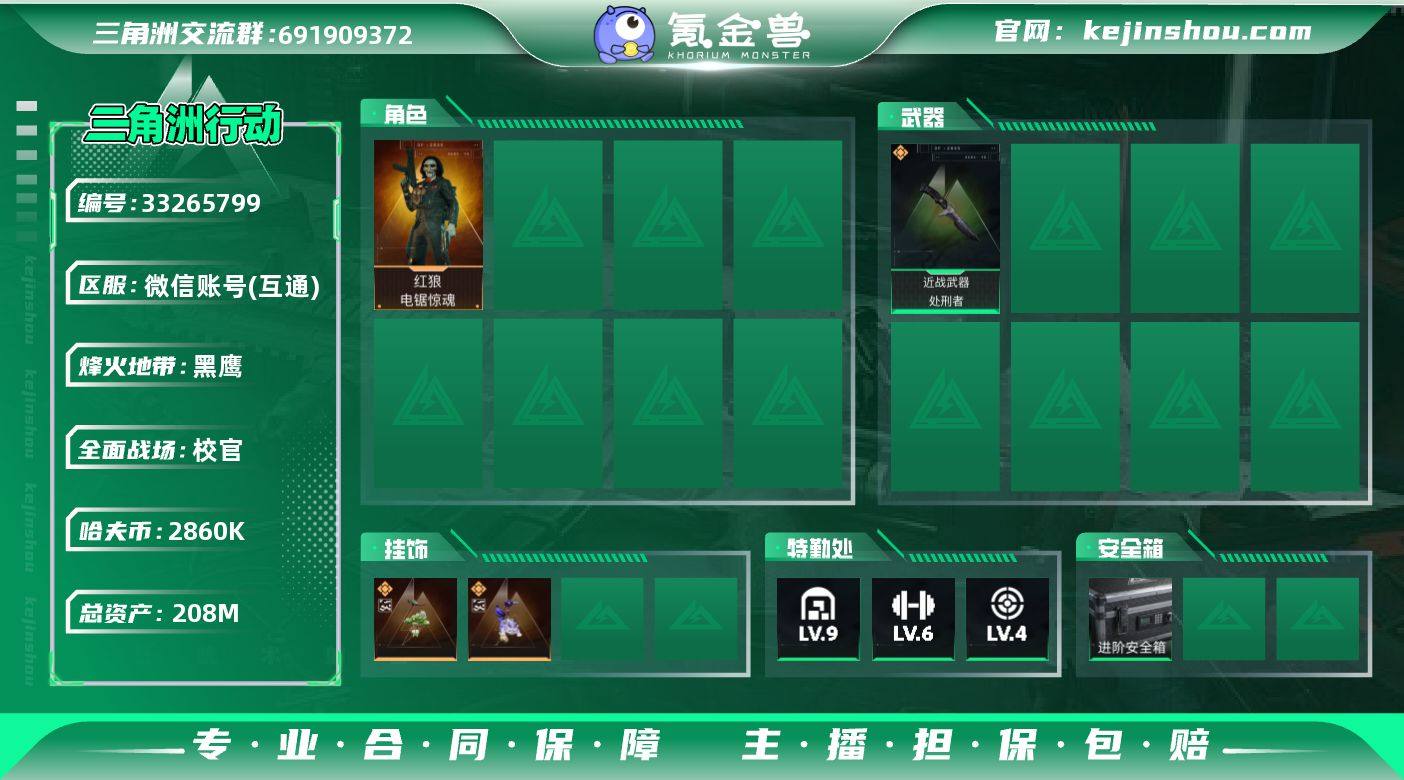 等级:60级满级 段位:黑鹰V 总资产:208M哈夫币,流动资产充足 稀有:电锯惊魂联动皮肤、橙色近战处刑者 枪皮:AWM金皮、M7橙皮等 仓库:6级甲头、大量金物资、钥匙卡齐全 账号安全可换绑,无封禁,上手即玩 诚心出,可小刀