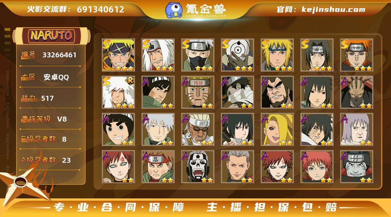 【2807】(可免费转苹果)V4 8S 23A 517万战力 5000金币 热门A忍者我爱罗 暴怒带土 S碎片金水门92片 YY2107 【S级忍者】:宇智波鼬「须佐能乎」(3星),旗木卡卡西「须佐能乎」(3星),自来也「舞之豪杰」(3星),自来也「传说中的三忍」(3星),波风水门(3星),佩恩「天道」(3星),宇智波斑 「白面具」(3星宇智波斑「白面具」),漩涡鸣人·宇智波佐助(3星) 【A级忍者】:迪达拉「秽土转生」(2星),奇拉比「忍界大战」(2星),飞段(2星),飞段「死司凭血」(2星),干柿鬼鲛(2星),机械鸣人「初始形态」(2星),迈特凯(2星),旗木卡卡西「幻之真容」(2星),桃地再不斩「秽土转生」(2星),我爱罗「疾风传」(2星),我爱罗「忍界大战」(2星),蝎(2星),蝎「绯流琥」(2星),猿飞阿斯玛(2星),宇智波鼬(2星),宇智波佐助「须佐能乎」(2星),宇智波带土「暴怒」(2星),李洛克「忍界大战」(2星),秋道丁次「忍界大战」(2星),千代「近松十人卫」(2星),神农「羁绊」(2星),宇智波泉奈(2星),迈特凯「青春爆炸」(2星)