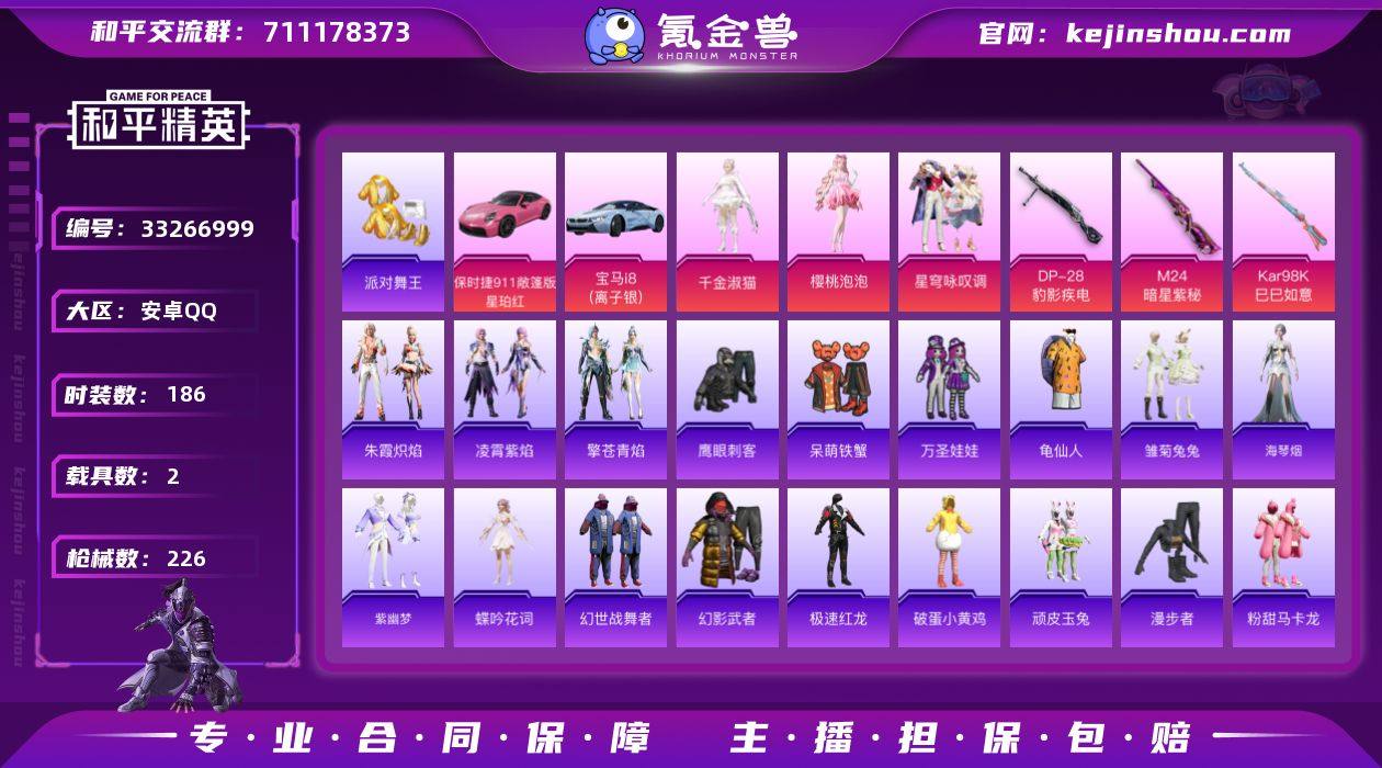 【955424】DYH18122【2载具-4粉装-5特效枪 深海小丑鱼 派对舞王 保时捷911粉色】有二次安卓手Q-2载具-4粉装-5特效枪-186套装-226枪皮-11王牌印记-不朽星钻Ⅰ-68497热力值【2载具】保时捷911 敞篷版(星珀红),宝马i8(离子银)【4粉装】角色-樱桃泡泡,角色-鸢尾珑雾,角色-千金淑猫,星穹咏叹调【5特效枪】M24-暗星紫秘[7级],Mk14-福马献瑞[5级],DP-28-豹影疾电[5级],ACE32-萌骑漫游[3级],Kar98K-巳巳如意[5级]【2稀有】深海小丑鱼,派对舞王【16飞行器】破刃行动尾迹,无垠阁飞行器,冰柠泡泡飞行器,光之冒险尾迹,顶峰精英尾迹,空岛之星尾迹,红色滑翔尾迹,狂鲨锋刃飞行器,异域银装飞行器,鸡智如我飞行器,登顶巅峰飞行器,绝对恒星飞行器,提桶跑路飞行器,炫彩糖果飞行器,粉色滑翔尾迹,马上有福飞行器【401其它衣服和枪皮】智谋强哥,SS33特训,酒红色名流,麻辣教官,特战装甲,热血青春,SS32特训,夏日音浪,青涩时光,龙魂突击队,SS23特训,青团波波,破蛋小黄鸡,光之冒险,SS11特训,霓虹街区,大橘大利,都市魅力,吉莉礼服,旭日情侣,燕燕于飞,萌黄之夏,元气之梦,红釉青花,空岛之星,雪国风尚,甜蜜熊情侣,狂鲨锋刃,人气偶像,飞行日记,蓝色运动,青玉碎影,冰河战士,云魄琉璃,SS17特训,街头潮人,战术大师...