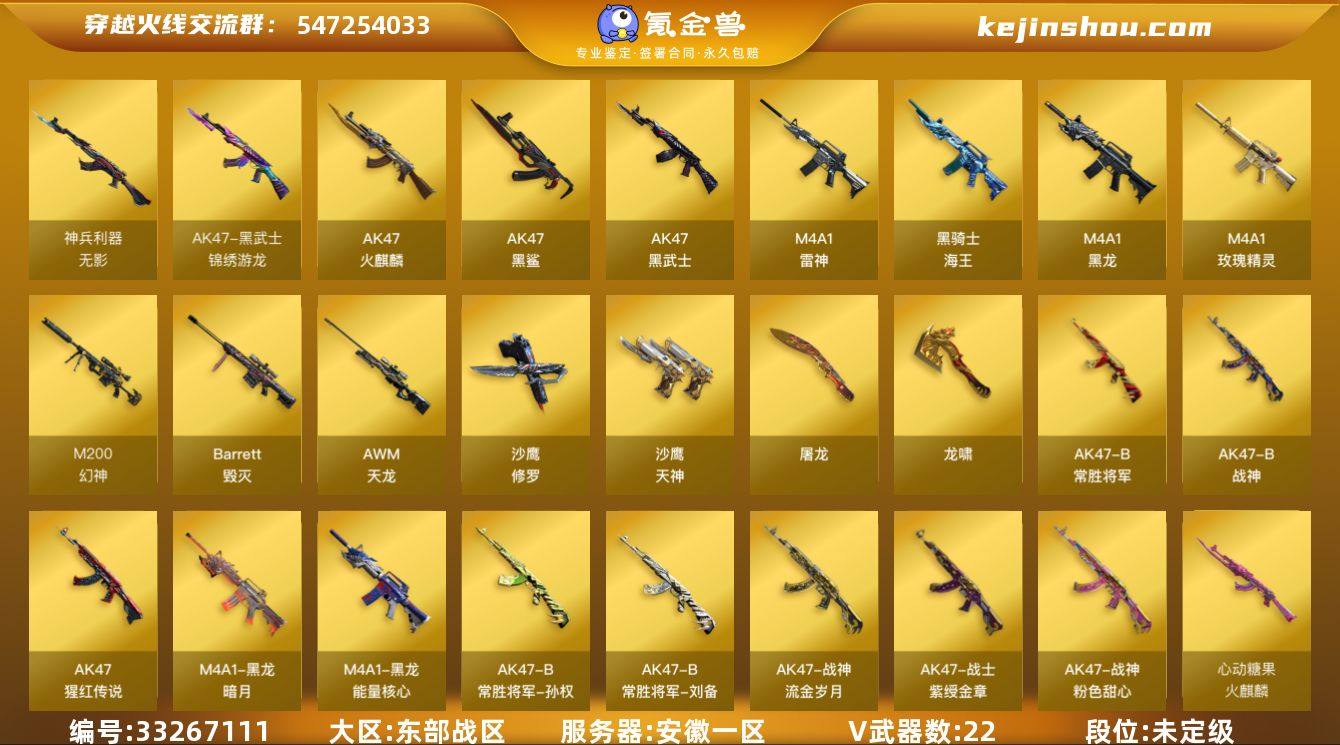 安徽一区-23V-1王者-0炫金 【热门武器】:M200-幻神,金色小号,C.A.T,沙鹰-修罗*2 【皮肤】:火麒麟-心动糖果,毁灭-荣耀之怒,黑龙-能量核心,黑龙-暗月,战神-粉色甜心皮肤*3,战神-紫绶金章皮肤,战神-流金岁月皮肤,AK47-B-常胜将军-刘备,AK47-B-常胜将军-孙权*3,天神-暗月 【角色】:葵,修道士,暗夜-X,初恋灵狐,风暴女,虎妞,嘉年华灵狐,娟娟,灵动武士,灵狐-花神,灵狐者-X,灵狐者-黄金海岸,龙儿-小淘气,麻雀,曼陀罗-X,曼陀罗-礼服,萌儿,潘多拉-X,潘多拉-甜心教官,青霞仙子,斯沃特-X,新娜塔莎,影武者-X 【人偶武器】:AWM-灵狐-15周年嘉年华,COP-旗袍,C.A.T,迷你深渊冰龙,迷你生化手雷,闪光弹-小乔*2,闪光弹-貂蝉,高爆手雷-大乔,迷你艾比,灵狐娃娃手雷*2 【暴走生化】:超级对讲机 【挑战大师】:激光毁灭者III,神圣爆裂者-末日III 【英雄级武器】:AK47-火麒麟*2,M4A1-黑龙,M4A1-雷神,AK47-黑武士,AK47-黑鲨,无影-神兵利器,黑武士-锦绣游龙,M4A1-玫瑰精灵,王者之戮-觉醒版,AK-47-猩红传说,AK47-B-战神,黑骑士-海王,AK47-B-常胜将军,AWM-天龙,Barrett-毁灭,M200-幻神,沙鹰-修罗*2,沙鹰-天神,屠龙,龙啸,闪光弹-竞...