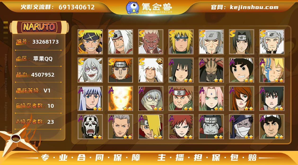 DHY757苹果Q【区服】646【等级】139【S级数量】10【A级数量】23 【S级】佩恩「天道」 艾「忍界大战」 千手扉间 宇智波鼬「须佐能乎」 漩涡鸣人·宇智波佐助 自来也「传说中的三忍」 自来也「舞之豪杰」 药师兜「仙人模式」 波风水门 千手扉间「秽土转生」 【A级】纲手「妖怪奇谭」 迪达拉 飞段「死司凭血」 李洛克「忍界大战」 我爱罗「疾风传」 干柿鬼鲛 桃地再不斩「秽土转生」 千代「近松十人卫」 波风水门「青年」 药师兜「半蛇斗篷」 宇智波鼬 漩涡鸣人「九尾查克拉」 迈特凯 宇智波泉奈 漩涡博人「桃式显现」 照美冥「五代目水影」 迈特凯「青春爆炸」 飞段 蝎 秋道丁次「忍界大战」 宇智波佐助「万花筒写轮眼」 加藤断 春野樱「百豪」 【B级】白「秽土转生」 勘九郎「疾风传」 春野樱「疾风传」 君麻吕「咒印」 贰「火之意志继承者」 汉「五尾人柱力」 春野樱「忍者少女」 赤土 手鞠「疾风传」 佩恩「畜生道」 佩恩「饿鬼道」 漩涡鸣人「疾风传」 枫「新佩恩六道」 御手洗红豆 李洛克「疾风传」 佩恩「地狱道」 山中井野「疾风传」 惠比寿 萨姆伊「新春限定」 日向花火「武当宗师」 天天「峨眉宗师」 秋道丁次「疾风传」 君麻吕「漂泊浪客」 野原琳「漂泊浪客」 天天「...