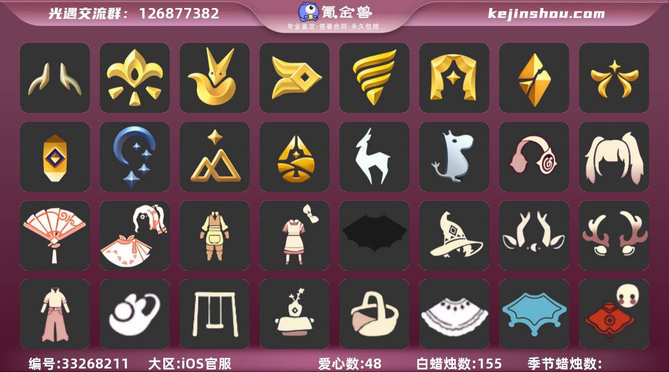 账号类型: 手机账号 季节已毕业: 小王子季,风行季,潜海季,表演季,破晓季,欧若拉季,集结季,夜行季,追忆季,拾光季,归巢季,九色鹿季,姆明季,织光季 完成地图: 云野,暮土 珍稀物品: 白枭,透明蝶翼斗,玫瑰花,彩虹围巾 礼包: 蝙蝠套,巫师,九色鹿角,鹿角,牛仔裤,兔子鞋,秋千,茶桌,餐桌,白绒金,瑞雪,福娃,吉他,奔跑发型,雪花球,橘子,贝壳,黄伞,兔子,南瓜,枯角,雪花,星月头饰,彩虹耳钉,彩虹耳机,新年裤,蝴蝶结,四叶草,暗彩装扮,向日葵套,雪人鞋,新年耳钉,遥鲲披肩斗篷,锦标赛桂冠,爱丽丝围裙套装礼包,园丁装扮,衔福献瑞礼包,献瑞折扇礼包,渐变双马尾发型礼包,云音伴游耳机 裤子: 背带裤,击剑裤,妮妮裙子,王子服,蓝绿裤,筑巢季·裤子,风行毕业裤子 面具: 九色鹿面具,裂纹面具,呼吸面具,夜行毕业面具,黄眉企鹅面具 面饰: 黑框眼镜 项链: 围巾 发型: 归巢毕业发型,若笠,虚荣,单侧绑发,小王子发型,留辫蘑菇头,飞天盘发 头饰: 行军锅头盔,羽毛发饰,牛仔帽,蓝色音乐会,平顶帽 斗篷: 黄色蓑衣,海洋斗,绿芽,粉红绒毛斗篷,遥鲲斗篷,黄色连帽披风,燕尾斗篷,冥龙斗篷,领主红斗篷,瑞雪斗篷,玫瑰褶边斗篷 配饰: 姆明抱枕,小红伞,相机,玫瑰花,鲲灯 亮点: 【优质装备】:表演季,白枭(帝企鹅发),小王子季(...
