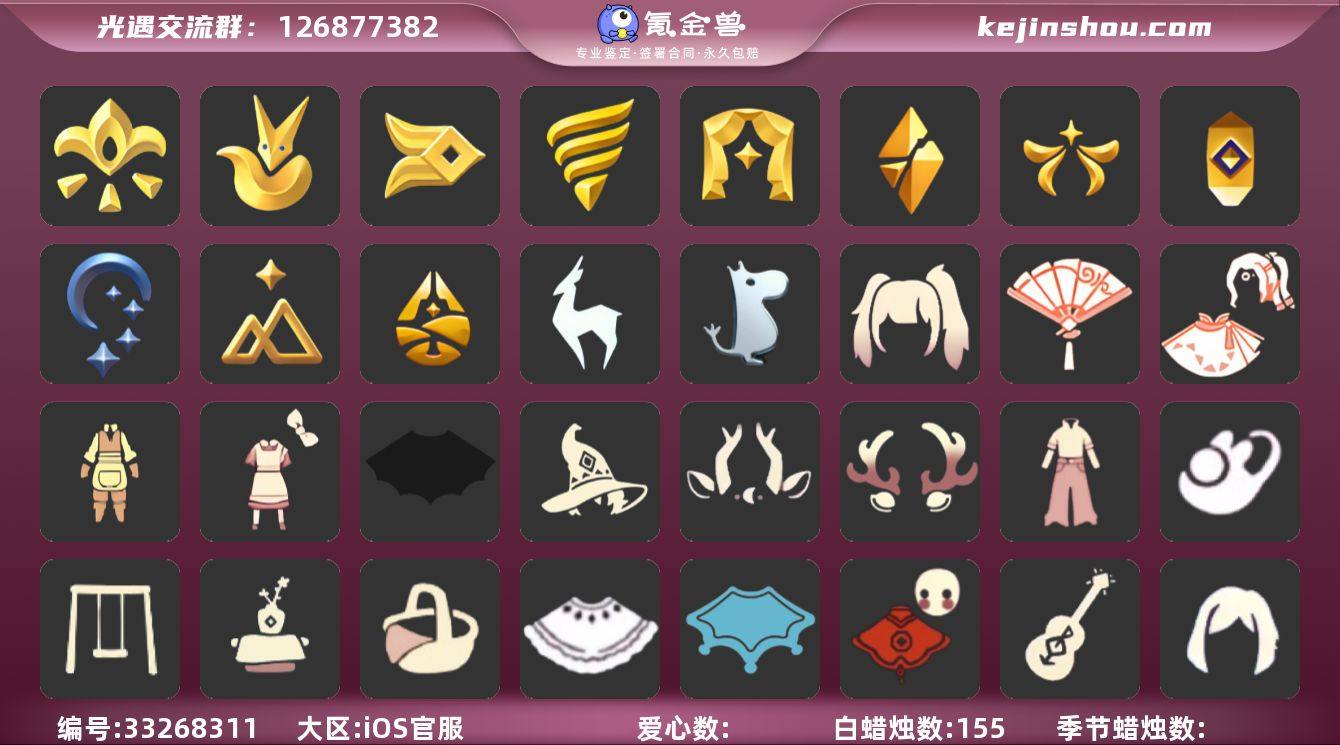 iOS官服 手机账号 4珍稀物品 14毕业季 2毕业图 155蜡烛 【珍稀物品】白枭(帝企鹅发),玫瑰花,透明蝶翼斗,彩虹围巾(五塑彩带斗) 【季节已毕业】集结季,小王子季(王子季),风行季,潜海季,表演季,破晓季,欧若拉季(欧若拉),追忆季,夜行季,拾光季,归巢季,九色鹿(九色鹿季),姆明季,织光季 【完成地图】云野,墓土(暮土) 【礼包】牛仔裤(阔腿牛仔),爱丽丝围裙套装礼包,兔子鞋(兔子拖鞋),雪人鞋(圣诞雪人靴),新年裤(瑞气服饰),园丁装扮,暗彩装扮(彩虹武士裤),蝴蝶结(大蝴蝶结),向日葵套(夏日有友礼包),奔跑发型(奔离远行发),巫师(巫师帽),渐变双马尾发型礼包(双马尾发型),橘子(大橘大利),锦标赛桂冠,雪花(雪花发夹),贝壳(贝壳发饰),兔子(玉兔头饰)(玉兔发饰)(兔子发饰),四叶草(四叶草头饰),星月头饰(星月头冠),九色鹿角(神鹿祝福头饰)(神鹿祝福礼包),新年耳钉(金鳞耳饰),彩虹耳钉(彩虹耳饰),彩虹耳机,枯角(巫树犄角),鹿角(圣诞鹿角),云音伴游耳机,福娃(福娃礼包)(春之日礼包)(铜钱斗),衔福献瑞礼包(衔福献瑞斗篷),遥鲲披肩斗篷(披肩外袍),蝙蝠套(蝙蝠斗篷)(南瓜头),瑞雪(瑞雪斗篷)(暖冬瑞雪),白绒金(白雪斗篷),吉他(音韵吉他)(白吉他),献瑞折扇礼包,黄伞(夏日阳伞),秋千(情人秋千),茶桌(...