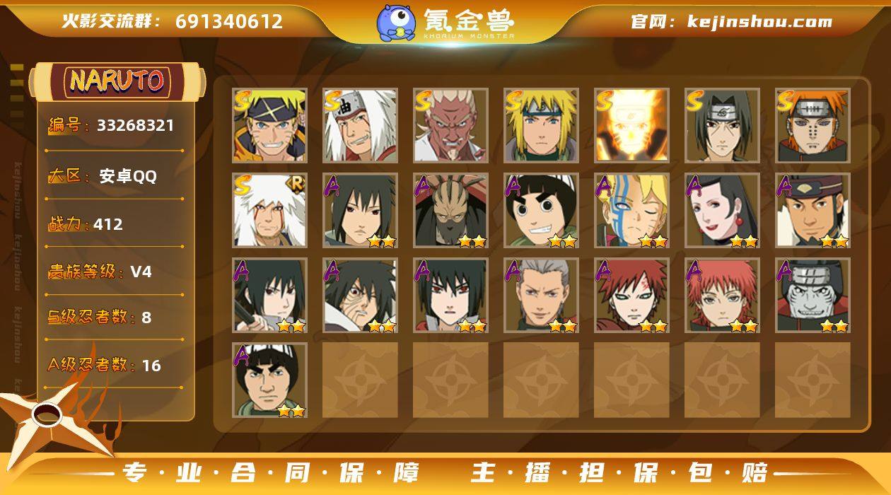 DHY718【S忍者8 A忍者16 通灵12】【安卓Q-3686区-135级-V4-412万战力】【S级】艾「忍界大战」 漩涡鸣人「九喇嘛连结」 宇智波鼬「须佐能乎」 佩恩「天道」 波风水门 漩涡鸣人·宇智波佐助 自来也「传说中的三忍」 自来也「舞之豪杰」【A级】干柿鬼鲛 宇智波佐助「万花筒写轮眼」 迈特凯 蝎「绯流琥」 猿飞阿斯玛 李洛克「忍界大战」 宇智波泉奈 宇智波鼬 宇智波佐助「须佐能乎」 宇智波带土「暴怒」 迈特凯「青春爆炸」 我爱罗「疾风传」 漩涡博人「桃式显现」 蝎 飞段 不缘【B级】药师兜 惠比寿 御手洗红豆 白 漩涡鸣人「疾风传」 旗木卡卡西「暗部」 漩涡玖辛奈 贰「火之意志继承者」 春野樱「疾风传」 佐井「最终章」 君麻吕 雨琉「羁绊」 枫「新佩恩六道」 佩恩「畜生道」 奈良鹿丸「最终章」 春野樱「忍者少女」 天天「疾风传」 宇智波佐助「疾风传」 君麻吕「咒印」 油女志乃「新春限定」 君麻吕「漂泊浪客」 西瓜山河豚鬼「忍刀七人众」 天天「峨眉宗师」 宇智波鼬「暗部」 重吾「忍界大战」 佩恩「地狱道」 勘九郎「疾风传」 佩恩「人间道」 野原琳「漂泊浪客」 夕日红 矢仓「三尾人柱力」 木叶丸「疾风传」 山中井野「疾风传」 佩恩「饿鬼道」 鬼灯满月「忍刀七人众」...