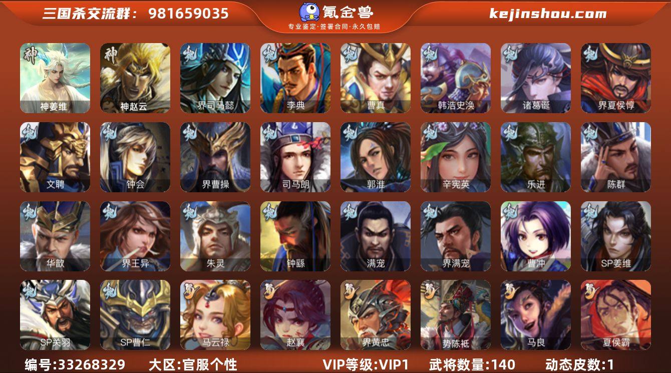 【14790113】官阶:先锋将军;VIP等级:VIP1;史诗武将数量:8;动态皮肤数量:1;武将总数:140;史诗宝珠数量:0;将魂数量:3657;神将:2;魏国史诗武将:0;蜀国史诗武将:3;吴国史诗武将:2;群史诗武将:1