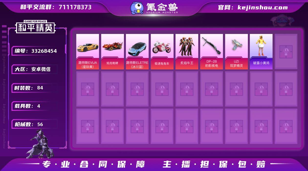 安卓 微信-1粉装-2特效枪-4载具-1粉色飞行器-20047热力值-1王牌印记-42套装-56枪皮 【粉色套装】:粉装-炙焰牛王 【粉色枪皮等级】:UZI-筑梦精灵(三级),DP-28-豹影疾电(三级) 【粉色载具】:路特斯EVIJA(星际黄),路特斯ELETRE(冰川蓝),焰龙咆哮,极速兔兔车 【粉色枪皮】:UZI-筑梦精灵,DP-28-豹影疾电 【粉色飞行器】:青春物语飞行器 【粉色降落伞】:青春物语降落伞,橘柚倾心降落伞,筑梦精灵降落伞 【稀有枪皮】:AKM-灼热熔岩,AKM-筑梦精灵,M16A4-甜心亚梦,SCAR-L-炫彩节奏,M416-蓝色火焰,AUG-幻梦音符,AUG-耀粉歌者,QBZ-飞驰魅影,M762-彩虹符号,AC-VAL-甜心亚梦,UZI-天降萌叽,UMP45-蓝色火焰,Vector-彩虹符号,Vector-生命誓言,汤姆逊-庄周梦蝶,汤姆逊-甜梦小狐,P90-筑梦精灵,P90-飞驰魅影,Kar98K-飞驰魅影,M24-炫彩节奏,AWM-恐龙拽拽,AWM-炙焰牛王,SKS-幻梦音符,SKS-炫彩节奏,Mini14-筑梦精灵,Mini14-耀粉歌者,S686-奇异狩猎者,S686-红色方程式,S1897-飞驰魅影,S12K-破晓战魂,DBS-甜心亚梦,M249-破晓战魂,DP-28-彩虹符号,DP-28-甜心亚梦,MG3-幻世战舞者,沙漠之鹰-王牌投手 【其他套装】:套装-SS19特训,套装-SS20特训,...
