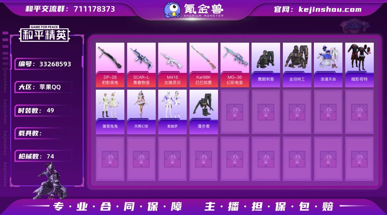 【955449】DYH18115【1粉装-6特效枪深海小丑鱼,暗影哥特,浪漫天命】有二次 苹果手Q-1粉装-6特效枪-49套装-74枪皮-0王牌印记-不朽星钻Ⅴ-20185热力值【1粉装】角色-智耀战神【6特效枪】Kar98K-巳巳如意[5级],ACE32-萌骑漫游[3级],DP-28-豹影疾电[4级],MG-36-幻彩电音[2级],M416-女娲灵识[3级],SCAR-L-青春物语[4级]【3稀有】深海小丑鱼,暗影哥特,浪漫天命【1飞行器】荒原烈焰飞行器【113其它衣服和枪皮】智谋强哥,SS32特训,元气之梦,风舞幻音,漫步者,缤纷果语,老实芭蕉,SS31特训,SS34特训,街头风暴,清新柠檬,粉恋花,阳光火鸡,红釉青花,SS35特训,SS33特训,迅捷龙虾,雏菊兔兔,狙击之神,蓝冰羽,巳巳如意,街头潮人,竞技名士,森林游猎者,特训学院,黄色运动,战术大师,雨过天青,紫幽梦,SS38特训,魅力单车,红色运动,薄荷星砂,海岛探路者,恋语绒绒,SS30特训,角色-唐三,SS37特训,鹰眼刺客,日照花林,角色-X,金羽特工,长空猛禽,夏日倾情,萝兰蝴蝶,SCAR-L-红色方程式,S1897-紫幽梦,PKM-紫幽梦,MG3-火熔核心,AKM-涂鸦街区,S1897-糯团青竹,R1895-雏菊兔兔,AA12-G-雨过天青,野牛-雏菊兔兔,AKM-龙的传人,MG3-幻世战舞者,M762-第五大道,UZI-影袭,MP5K-未来领航者,20-H-星途旅人,平底锅-雏菊兔兔,AR...