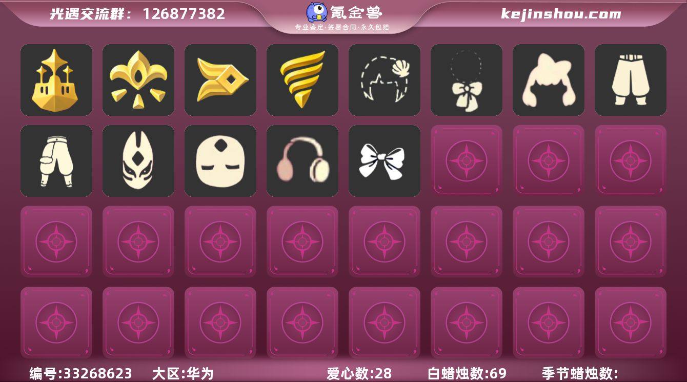 已经毕业季节:梦想季,集结季,风行季,潜海季,表演季 已经毕业的地图:晨岛,云野,雨林,霞谷,墓土,禁阁 热门物品:绊爱 tgc 武士裤 白枭 各季节百分数: 梦想季:100 % 预言季:有卡半 % 圣岛季:有卡半 % 集结季:100 % 小王子季:有卡未 % 重组季:100 % 风行季:100 % 潜海季:100 % 表演季:100 % 各地图百分数: 晨岛:100 % 云野:100 % 雨林:100 % 霞谷:100 % 墓土:100 % 禁阁:100 % 稀有礼包与稀有物品:伴爱联动礼包,tgc斗篷礼包, 橘子礼包,首充橙斗,贝壳,创始人礼包,花憩茶几,白枭 复刻发型:龙骨,卡卡,雨妈,蝴蝶结,正太头, 红耳机,公主头,樱花头 复刻面具:矮人面具,红狐狸,黄鼠狼面具 复刻斗篷:花瓣斗篷,红金斗篷,白金斗篷,灯泡斗篷 复刻裤子:武士裤,搓澡巾,白棉裤 复刻背饰:椅子,小钢琴,铃铛,排箫,高音钢琴,尤克里里 身高0.01-12.01 当前9.5
