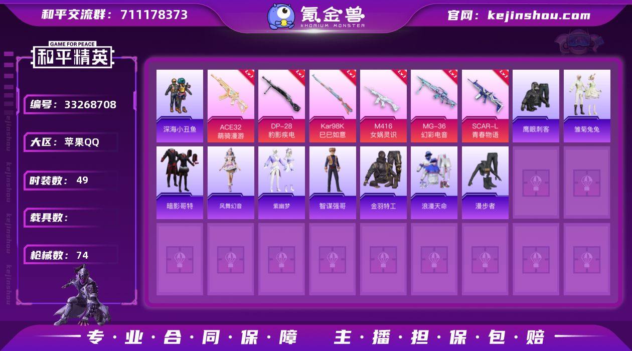 DYH18115【1粉装-6特效枪深海小丑鱼,暗影哥特,浪漫天命】有二次 苹果手Q-1粉装-6特效枪-49套装-74枪皮-0王牌印记-不朽星钻Ⅴ-20185热力值【1粉装】角色-智耀战神【6特效枪】Kar98K-巳巳如意[5级],ACE32-萌骑漫游[3级],DP-28-豹影疾电[4级],MG-36-幻彩电音[2级],M416-女娲灵识[3级],SCAR-L-青春物语[4级]【3稀有】深海小丑鱼,暗影哥特,浪漫天命【1飞行器】荒原烈焰飞行器【113其它衣服和枪皮】智谋强哥,SS32特训,元气之梦,风舞幻音,漫步者,缤纷果语,老实芭蕉,SS31特训,SS34特训,街头风暴,清新柠檬,粉恋花,阳光火鸡,红釉青花,SS35特训,SS33特训,迅捷龙虾,雏菊兔兔,狙击之神,蓝冰羽,巳巳如意,街头潮人,竞技名士,森林游猎者,特训学院,黄色运动,战术大师,雨过天青,紫幽梦,SS38特训,魅力单车,红色运动,薄荷星砂,海岛探路者,恋语绒绒,SS30特训,角色-唐三,SS37特训,鹰眼刺客,日照花林,角色-X,金羽特工,长空猛禽,夏日倾情,萝兰蝴蝶,SCAR-L-红色方程式,S1897-紫幽梦,PKM-紫幽梦,MG3-火熔核心,AKM-涂鸦街区,S1897-糯团青竹,R1895-雏菊兔兔,AA12-G-雨过天青,野牛-雏菊兔兔,AKM-龙的传人,MG3-幻世战舞者,M762-第五大道,UZI-影袭,MP5K-未来领航者,20-H-星途旅人,平底锅-雏菊兔兔,ARX-像素花束...