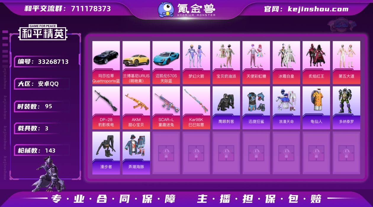 【955443】DYH18118【身法号3载具-6粉装-4特效枪梦幻火箭 AKM甜心宝贝7级】安卓手Q-3载具-6粉装-4特效枪-95套装-143枪皮-15王牌印记-不朽星钻Ⅴ-48819热力值【3载具】迈凯伦570S(天际蓝),玛莎拉蒂Quattroporte(夜幕蓝),兰博基尼URUS(明艳黄)【6粉装】梦幻火箭,天使彩虹糖,第五大道,宝贝奶油派,冰霜白皇,炙焰红王【4特效枪】Kar98K-巳巳如意[5级],DP-28-豹影疾电[5级],SCAR-L-童趣迷兔[7级],AKM-甜心宝贝[7级]【1稀有】浪漫天命【7飞行器】梦幻火箭飞行器,狂鲨锋刃飞行器,异域银装飞行器,顶峰精英尾迹,炫彩糖果飞行器,鸡智如我飞行器,萌物绒绒飞行器【3头盔】梦幻火箭头盔,甜心宝贝头盔,童趣迷兔头盔【2背包】梦幻火箭背包,甜心宝贝背包【227其它衣服和枪皮】炫彩糖果,长空猛禽,甜梦熊熊,巳巳如意,顶瓜瓜,龙魂突击队,空岛之星,星途旅人,夏雨游龙,SS25特训,弄潮海豚,萌趣咩咩,蝶变,娇憨猪猪,魅力单车,幻彩翩翩,SS36特训,牛气满满,SS17特训,角色-多纳泰罗,龙的传人,竞技名士,懵萌河马,街头风暴,SS30特训,牛气冲天,SS22特训,青涩时光,麻辣教官,迅捷狂鲨,荣耀,醇脆可可,恶魔宝贝,玩偶服-懒羊羊,格斗先锋,缤纷果语,暗夜傀儡,甜蜜熊情侣,SS20特训,萌鸡速递,怒火燎原,SS15特训,黄色运动...
