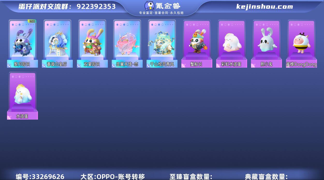 黎月园长,欢宴园长,千山绘灵青岚,蔷薇白皇后,圣翼天使-恋 彩虹水波蛋,胆小鬼,蜜蜂DongDong,水波蛋,蟹船长 段位:超级凤凰蛋 卖家说:黎月情号急出 有古早表情 动作 有山水谣 轻鸾仙羽 还有问号鸭 沙滩龟
