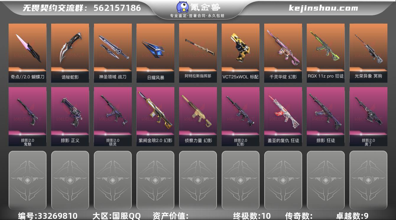 L3255 【性价比】紫金幻影 光荣异象大狙 掠夺2.0套 掠夺正义 vct25wolf标配 盖亚狂徒 侦查幻影 奇点蝴蝶刀 显卡狂徒 掠夺狂徒 莲花幻影库存: 24330剩余VP:176剩余R点:145 段位:白银历史最高:铂金