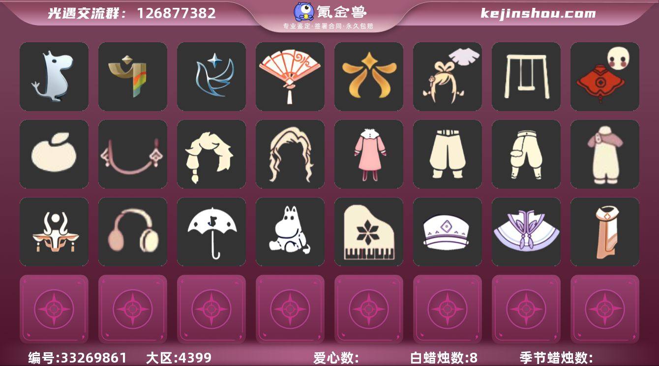 安卓官服 邮箱账号 3毕业季 2毕业图 8蜡烛 【季节已毕业】姆明季,彩染季,青鸟季 【完成地图】雨林,霞谷 【礼包】绊爱(绊爱斗篷)(绊爱礼包),橘子(大橘大利),新年耳钉(金鳞耳饰),欧若拉之翼,福娃(福娃礼包)(春之日礼包)(铜钱斗),献瑞折扇礼包,秋千(情人秋千) 【裤子】妮妮裙子(妮妮长裙),武士裤,背带裤,搓澡巾 【面具】辉光羚羊面具 【面饰】青鸟毕业面饰(青鸟面饰),红耳机 【发型】单侧绑发(单边小辫),虚荣 【头饰】平顶帽 【斗篷】青鸟毕业斗篷(青鸟斗篷),彩染围巾斗篷,绿芽 【配饰】小红伞(姆明红伞)(姆明大伞),姆明抱枕,高音钢琴(白色高脚钢琴)