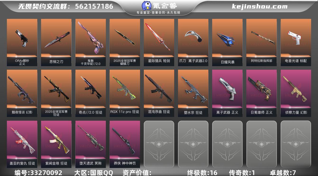 【3.9W库存.25冠军套.怜悯套.黑波.塑水宗.混沌.侦查】【套装】:2025全球冠军赛套装,无畏契约季前邀请赛套装 【英雄】:幻棱,炼狱,维斯,暮蝶,钛狐,壹决,铁臂,捷风,雷兹,幽影,不死鸟,贤者,猎枭,蝰蛇,零,芮娜,奇乐,尚勃勒,霓虹,斯凯,夜露,星礈,K/O,海神,盖可,黑梦,钢锁 【近战武器】:近战武器-2025全球冠军赛 蝴蝶刀,近战武器-碎心裂刃,近战武器-无畏契约季前邀请赛 悲悯之刃,近战武器-黑波之刃,近战武器-离子武器//2.0 爪刀,近战武器-日耀风暴 遗器,近战武器-阿特拉斯指挥部 甩棍,近战武器-星际猎兵 短剑 【狂徒】:狂徒-2025全球冠军赛,狂徒-混沌序曲,狂徒-奇点//2.0,狂徒-塑水宗,狂徒-RGX 11z Pro,狂徒-盖亚的复仇,狂徒-紫阙金琅 【幻影】:幻影-黯夜怪谈,幻影-侦察力量 【戍卫】:戍卫-沙场老兵 【冥驹】:冥驹-堕天遗武 【莽侠】:莽侠-神中神罚 【骇灵】:骇灵-无限竞技 【标配】:标配-电音光谱,标配-电音光谱 【正义】:正义-ORA x 颗秒,正义-离子武器,正义-日冕雄师 【鬼魅】:鬼魅-千灵华绽//2.0 【卡面】:热舞环节 卡面,树懒大作战 卡面,红鳞松叶 卡面,Clutch 卡面,梦幻奶茶 卡面,西装暴徒 卡面,暮蝶工牌 卡面...