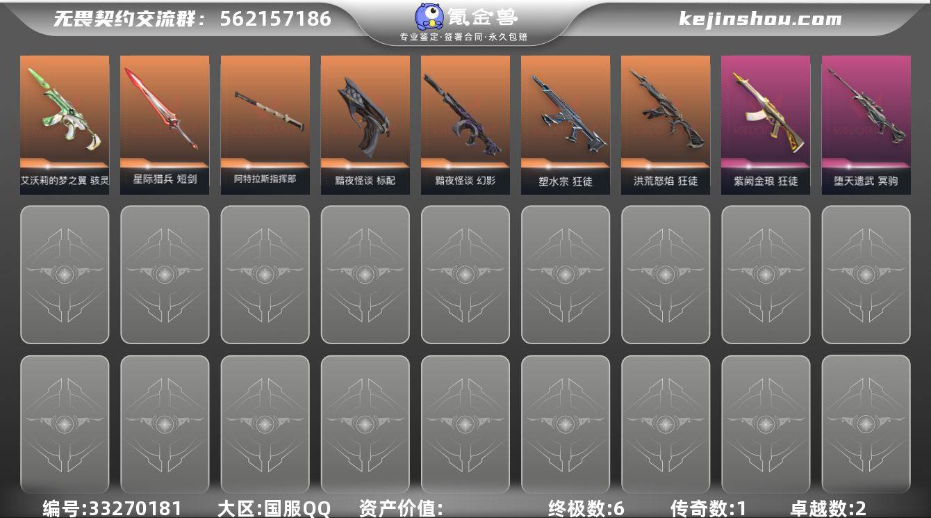 【精品小号.下三段.流脓.塑水宗.紫金.古神】【英雄】:幻棱,炼狱,暮蝶,钛狐,壹决,铁臂,捷风,幽影,不死鸟,贤者,猎枭,零,芮娜,霓虹,斯凯,夜露,星礈,K/O,盖可,黑梦,钢锁 【近战武器】:近战武器-阿特拉斯指挥部 甩棍,近战武器-星际猎兵 短剑 【狂徒】:狂徒-洪荒怒焰,狂徒-塑水宗,狂徒-紫阙金琅 【幻影】:幻影-黯夜怪谈 【冥驹】:冥驹-堕天遗武 【骇灵】:骇灵-艾沃莉的梦之翼,骇灵-无限竞技 【标配】:标配-黯夜怪谈 【卡面】:Clutch 卡面,无畏契约GO!第一卷:芮娜 卡面,无畏契约GO!第一卷:零 卡面,无畏契约GO!第一卷:贤者 卡面,钢锁vs盖可 卡面,别冒尖 卡面,代号红色 卡面,新兵报到 卡面,V契约 卡面,无畏契约 卡面 【喷漆】:买装还是存钱 喷漆,暴走萝莉 喷漆,胜利属于无畏契约 喷漆,GLHF 喷漆,无畏契约 喷漆 【挂饰】:炼狱雪糕 挂饰,天外飞客 挂饰,无畏契约 纪念币 挂饰