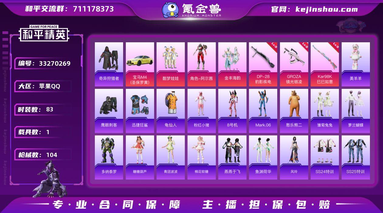 苹果 手Q-3粉装-3特效枪-1载具-1粉色飞行器-32608热力值-8王牌印记-83套装-104枪皮 【热门品类】:套装-奇异狩猎者,套装-AG战队服,套装-龟仙人,套装-粉红小猪,角色-8号机,角色-Mark.06 【粉色套装】:粉装-酣梦娃娃,角色-阿尔茜,粉装-金丰海韵 【粉色枪皮等级】:GROZA-镜光银凌(五级),Kar98K-巳巳如意(五级),DP-28-豹影疾电(五级) 【粉色载具】:宝马M4(圣保罗黄) 【粉色枪皮】:GROZA-镜光银凌,Kar98K-巳巳如意,DP-28-豹影疾电 【粉色飞行器】:幽焰列车飞行器 【粉色降落伞】:甜心宝贝降落伞,星之信仰降落伞,江南烟雨降落伞,守护天翼降落伞,初号机 觉醒Ver.降落伞,时空协奏降落伞,千金淑猫降落伞,临安公主降落伞,幻影飞狐降落伞 【稀有套装】:套装-龟仙人,玩偶服-憨乐熊二,套装-雏菊兔兔,套装-萝兰蝴蝶,角色-多纳泰罗,套装-糖糖葫芦,套装-青团波波,套装-棉花软糖,套装-燕燕于飞,套装-鱼渊荷华,角色-风玲,玩偶服-美羊羊 【稀有枪皮】:AKM-影袭,AKM-恐龙拽拽,AKM-龙的传人,SCAR-L-夜灯,SCAR-L-炫彩节奏,M416-绯红前夜,GROZA-影袭,GROZA-懵萌河马,AUG-耀粉歌者,M762-天降萌叽,M762-奇异狩猎者,M762-甜心宝贝,Mk47-炫光之旅,G...