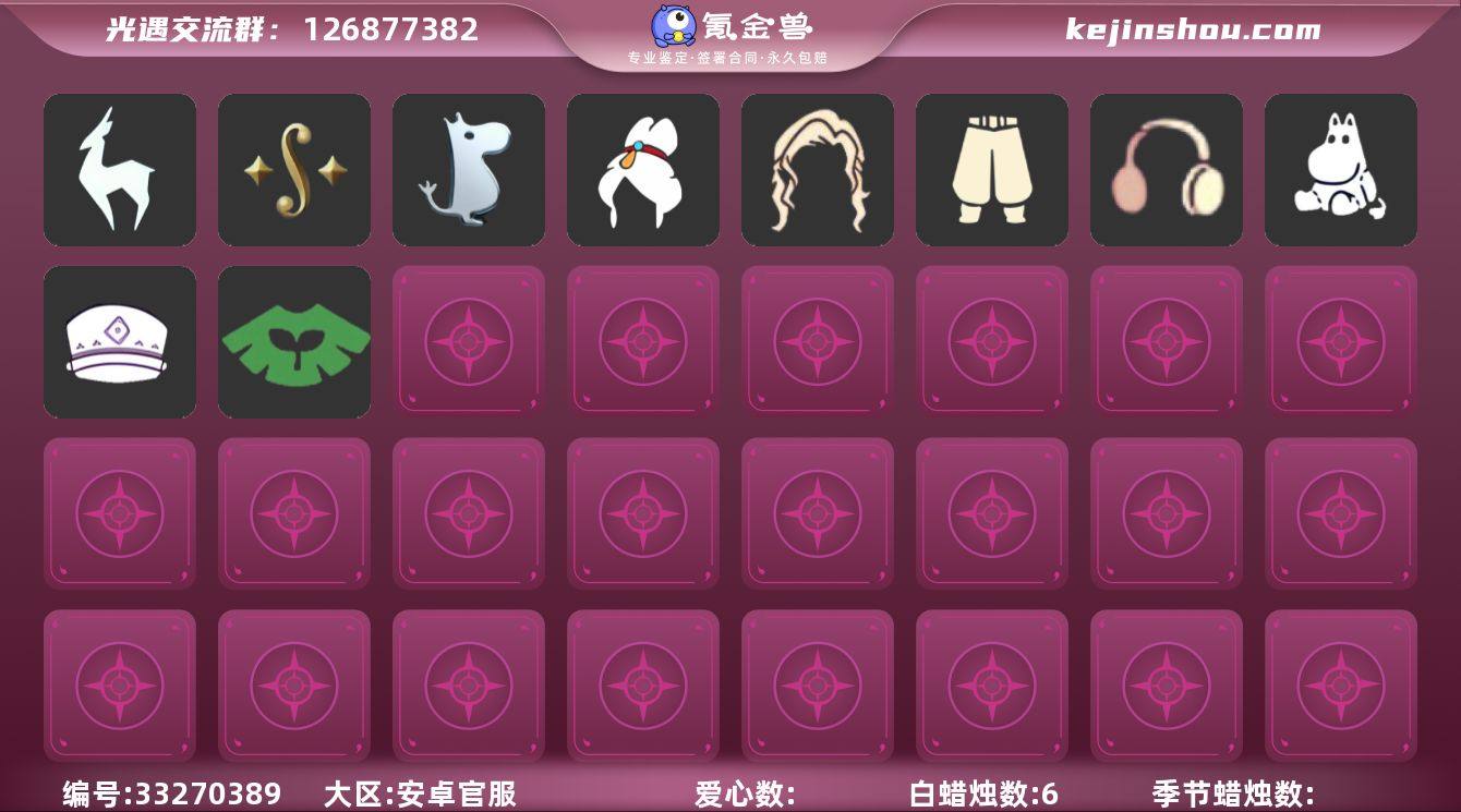 安卓官服 手机账号 3毕业季 6蜡烛 【季节已毕业】九色鹿(九色鹿季),二重奏季,姆明季 【礼包】兔子鞋(兔子拖鞋),橘子(大橘大利),小狗周年发饰(小狗周年头饰),贝壳(贝壳发饰),四叶草(四叶草头饰),新年耳钉(金鳞耳饰),线框斗篷礼包(周年线框斗篷) 【裤子】妮妮裙子(妮妮长裙),武士裤 【面饰】红耳机 【发型】飞天盘发(九色鹿丸子头),虚荣,若笠(箬笠) 【头饰】平顶帽 【斗篷】黄色蓑衣(道袍),绿芽 【配饰】小红伞(姆明红伞)(姆明大伞),姆明抱枕,筑巢季·小手办(光之子试衣)