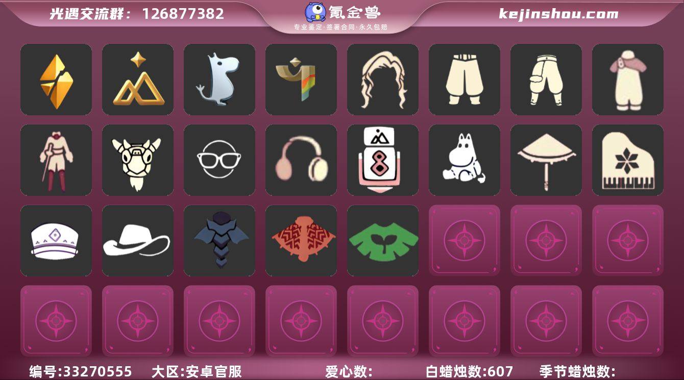 安卓官服 手机账号 4毕业季 2毕业图 607蜡烛 【季节已毕业】破晓季,拾光季,姆明季,彩染季 【完成地图】霞谷,墓土(暮土) 【礼包】兔子(玉兔头饰)(玉兔发饰)(兔子发饰) 【裤子】妮妮裙子(妮妮长裙),武士裤,背带裤,搓澡巾,击剑裤 【面具】辉光羚羊面具 【面饰】黑框眼镜(粗框眼镜),红耳机 【发型】虚荣,若笠(箬笠) 【头饰】平顶帽,蓝色音乐会(蓝色音乐符),牛仔帽(西部帽) 【斗篷】冥龙斗篷,遥鲲斗篷(双翼遥鲲斗),彩染围巾斗篷,黄色蓑衣(道袍),绿芽,海洋斗 【配饰】相机(季卡相机),小红伞(姆明红伞)(姆明大伞),姆明抱枕,雨伞,高音钢琴(白色高脚钢琴)