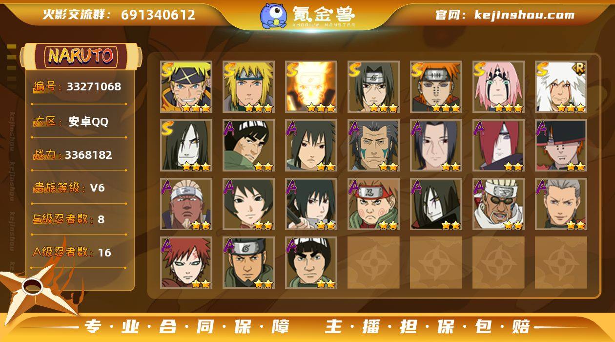 8S忍/16A忍/战力336W/V6/区服3055 【S忍者】 宇智波佐助「漩涡鸣人」,春野樱「忍界大战」,漩涡鸣人「九喇嘛连结」,自来也「舞之豪杰」,宇智波鼬「须佐能乎」,佩恩「天道」,波风水门,大蛇丸, 【A忍者】 佩恩·六道「漂泊浪客」,迈特凯「青春爆炸」,宇智波鼬「夏日限定」,不动,宇智波泉奈,长门「青年」,艾「青年」,黑土「四代目土影」,宇智波佐助「须佐能乎」,秋道丁次「忍界大战」,大蛇丸「晓」,奇拉比,飞段,我爱罗「疾风传」,猿飞阿斯玛,迈特凯, PX_2550020