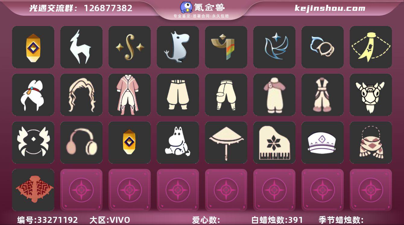 【礼包】牛仔裤(阔腿牛仔),优雅三件套(西装套装),兔子鞋(兔子拖鞋),新年裤(瑞气服饰),暗彩装扮(彩虹武士裤),巫师(巫师帽),绊爱(绊爱斗篷)(绊爱礼包),橘子(大橘大利),雪花(雪花发夹),兔子(玉兔头饰)(玉兔发饰)(兔子发饰),大耳狗发饰(迷你大耳狗发饰),四叶草(四叶草头饰),星月头饰(星月头冠),彩虹耳机,日光耳环,满月耳坠,枯角(巫树犄角),鹿角(圣诞鹿角),欧若拉之翼,福娃(福娃礼包)(春之日礼包)(铜钱斗),遥鲲披肩斗篷(披肩外袍),蝙蝠套(蝙蝠斗篷)(南瓜头),蜘蛛斗(蛛丝斗篷)(蛛网斗篷),青衫落拓礼包,红伞(瑞气纸伞),献瑞折扇礼包,音乐桌(网易云留声机),雪花球(雪花水晶球),仙境茶会门扉礼包