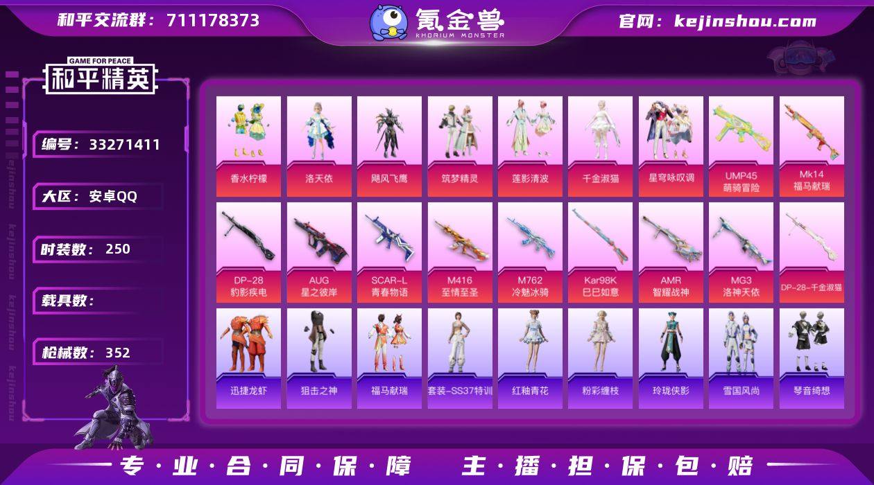 【0载具 11特效枪 7粉装 352枪皮 250套装】满级至情至圣 满级青春物语 满级星之彼岸 21印记 11万热力值 女号 雪山精英,激萌罗小黑,香水柠檬,洛天依,飓风飞鹰,筑梦精灵,莲影清波,老实芭蕉,Mark.06,千金淑猫,星穹咏叹调 AUG-星之彼岸,SCAR-L-青春物语,M416-至情至圣,M762-冷魅冰骑,Kar98K-巳巳如意,AMR-智耀战神,Mk14-福马献瑞,UMP45-萌骑冒险,MG3-洛神天依,DP-28-千金淑猫,DP-28-豹影疾电 20/2 df12-40,编号:WPOIM66