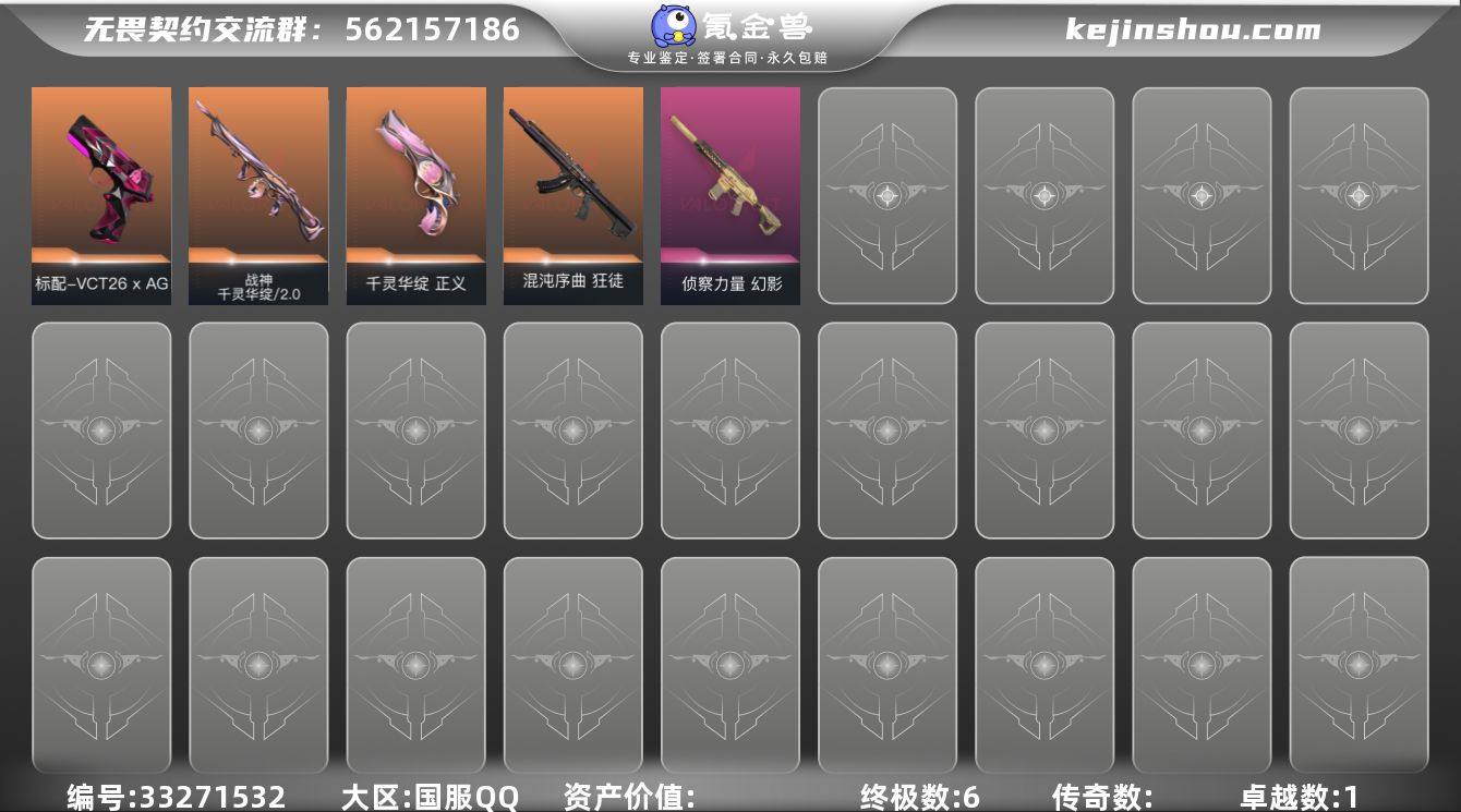 【英雄】:炼狱,壹决,捷风,不死鸟,贤者,猎枭,零,芮娜,霓虹,斯凯,夜露,K/O,黑梦 【近战武器】:近战武器-镭切 【狂徒】:狂徒-混沌序曲 【幻影】:幻影-侦察力量 【战神】:战神-千灵华绽//2.0 【VCT手枪】:标配-VCT26 x AG 【正义】:正义-千灵华绽 【卡面】:无畏契约GO!第一卷:芮娜 卡面,无畏契约GO!第一卷:零 卡面,代号红色 卡面,新兵报到 卡面,V契约 卡面,无畏契约 卡面 【喷漆】:买装还是存钱 喷漆,红牌退场 喷漆,胜利属于无畏契约 喷漆,GLHF 喷漆,无畏契约 喷漆 【挂饰】:天外飞客 挂饰,无畏契约 纪念币 挂饰