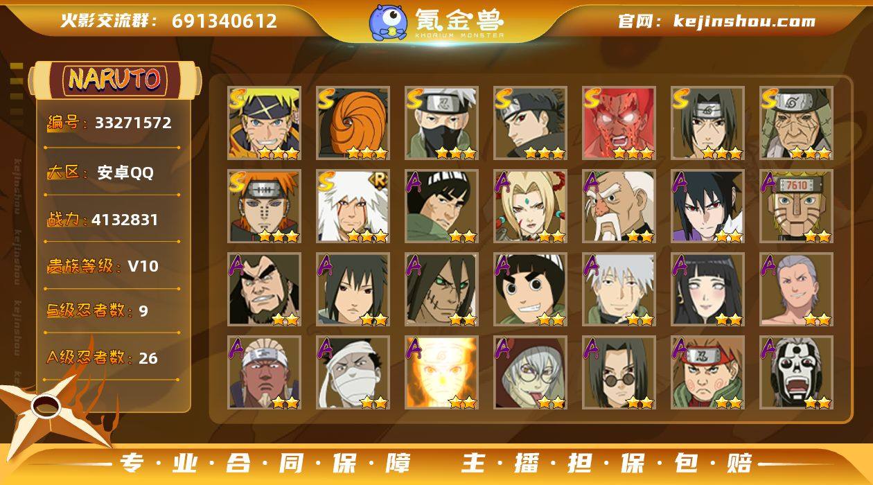 9S忍/26A忍/战力413W/V10/区服4140 【S忍者】 宇智波佐助「漩涡鸣人」,宇智波止水「须佐能乎」,宇智波斑「五影会谈」,迈特凯「死门」,自来也「舞之豪杰」,旗木卡卡西「须佐能乎」,猿飞日斩「秽土转生」,宇智波鼬「须佐能乎」,佩恩「天道」, 【A忍者】 宇智波佐助「侠隐江湖」,宇智波鼬「新春限定」,桃地再不斩「漂泊武士」,机械鸣人「初始形态」,大野木「侠隐江湖」,纲手「妖怪奇谭」,迈特凯「青春爆炸」,日向雏田「最终章」,旗木卡卡西「幻之真容」,李洛克「忍界大战」,宇智波泉奈,神农「羁绊」,角都「秽土转生」,飞段「晓创生」,艾「青年」,漩涡鸣人「九尾查克拉」,药师兜「半蛇斗篷」,秋道丁次「忍界大战」,飞段「死司凭血」,飞段,迪达拉,我爱罗「疾风传」,蝎,干柿鬼鲛,宇智波鼬,猿飞阿斯玛, PX_2551521