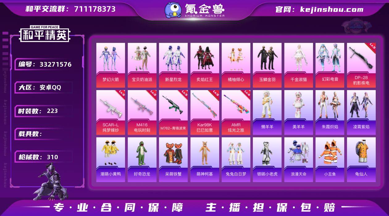 【955464】安卓 手Q-8粉装-6特效枪-0载具-3粉色飞行器-94034热力值-20王牌印记-223套装-310枪皮 【热门品类】:粉装-梦幻火箭,套装-浪漫天命,套装-小丑鱼,套装-龟仙人,套装-潮萌小黄鸭 【粉色套装】:粉装-宝贝奶油派,粉装-梦幻火箭,粉装-新星烈龙,粉装-炙焰红王,粉装-橘柚倾心,粉装-玉鳞金羽,角色-千金淑猫,粉装-幻彩电音 【粉色枪皮等级】:SCAR-L-纯梦嫁纱(五级),M416-电玩时刻(五级),M762-青锋波束(五级),Kar98K-巳巳如意(五级),AMR-炫光之旅(四级),DP-28-豹影疾电(五级) 【粉色枪皮】:SCAR-L-纯梦嫁纱,M416-电玩时刻,M762-青锋波束,Kar98K-巳巳如意,AMR-炫光之旅,DP-28-豹影疾电 【粉色飞行器】:炫彩糖果飞行器,星夜魔法师飞行翼,动力核心飞行器 【粉色降落伞】:甜心宝贝降落伞,梦幻火箭降落伞,童趣迷兔降落伞,暗夜玫瑰降落伞,音爆索尼克降落伞,第五大道降落伞,蜜语绒猫降落伞,千金淑猫降落伞,月影灵韵降落伞,雪月幻音降落伞,星穹咏叹调降落伞,幻彩电音降落伞,奇迹舞步降落伞,无垠阁降落伞,喜羊羊与灰太狼降落伞,炫彩糖果降落伞 【稀有套装】:套装-龟仙人,套装-巳巳如意,套装-炫彩糖果,套装-雏菊兔兔,套装-萝兰蝴蝶,套装...