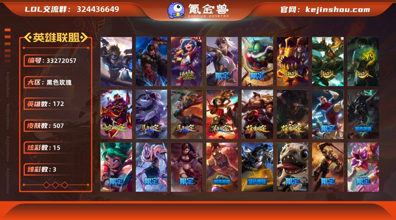 个人一手号,黑色玫瑰全英雄,507皮肤含龙瞎+蓝龙瞎双特效,95限定32传说,无封禁可二次实名,全程平台交易,到手即玩,诚心出!